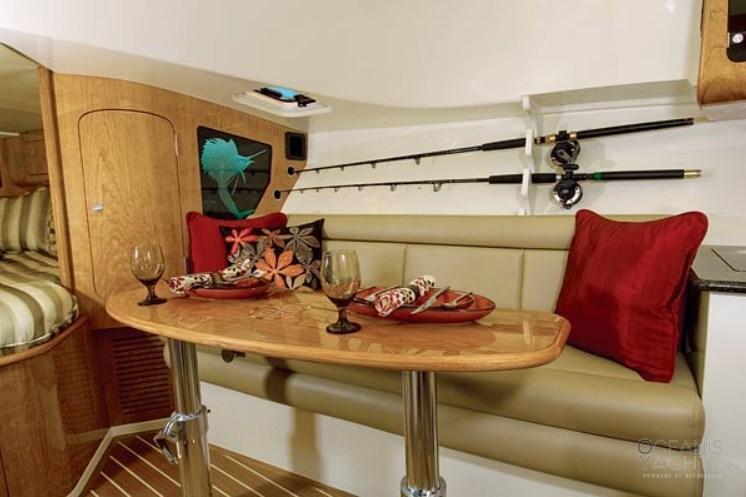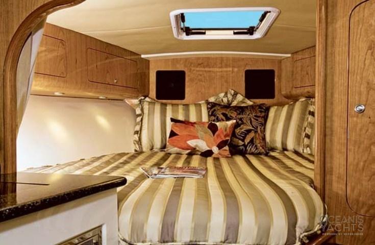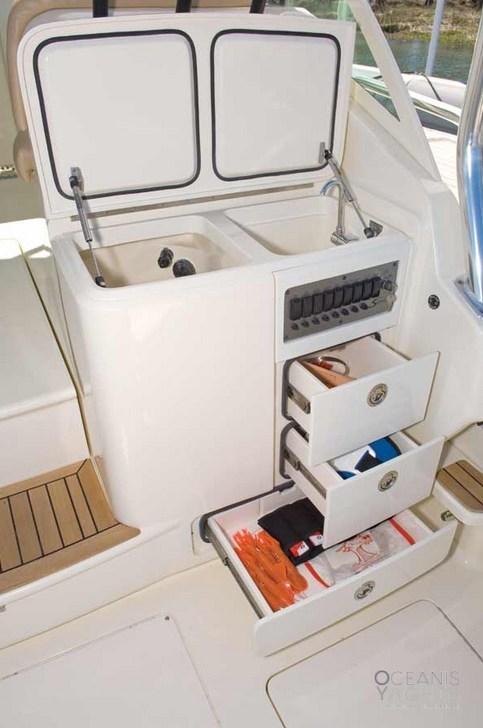 La configuration en contournement avec un grand cockpit le rend idéal à la fois pour la pêche sportive et pour les excursions d’une journée et les courtes croisières. Les espaces extérieurs sont conçus pour la pêche, avec des aquariums verts, des caisses à poissons et du matériel dédié, tandis que l’intérieur propose une cabine confortable avec un lit double, une salle à manger convertible, une salle de bain séparée et une kitchenette équipée.