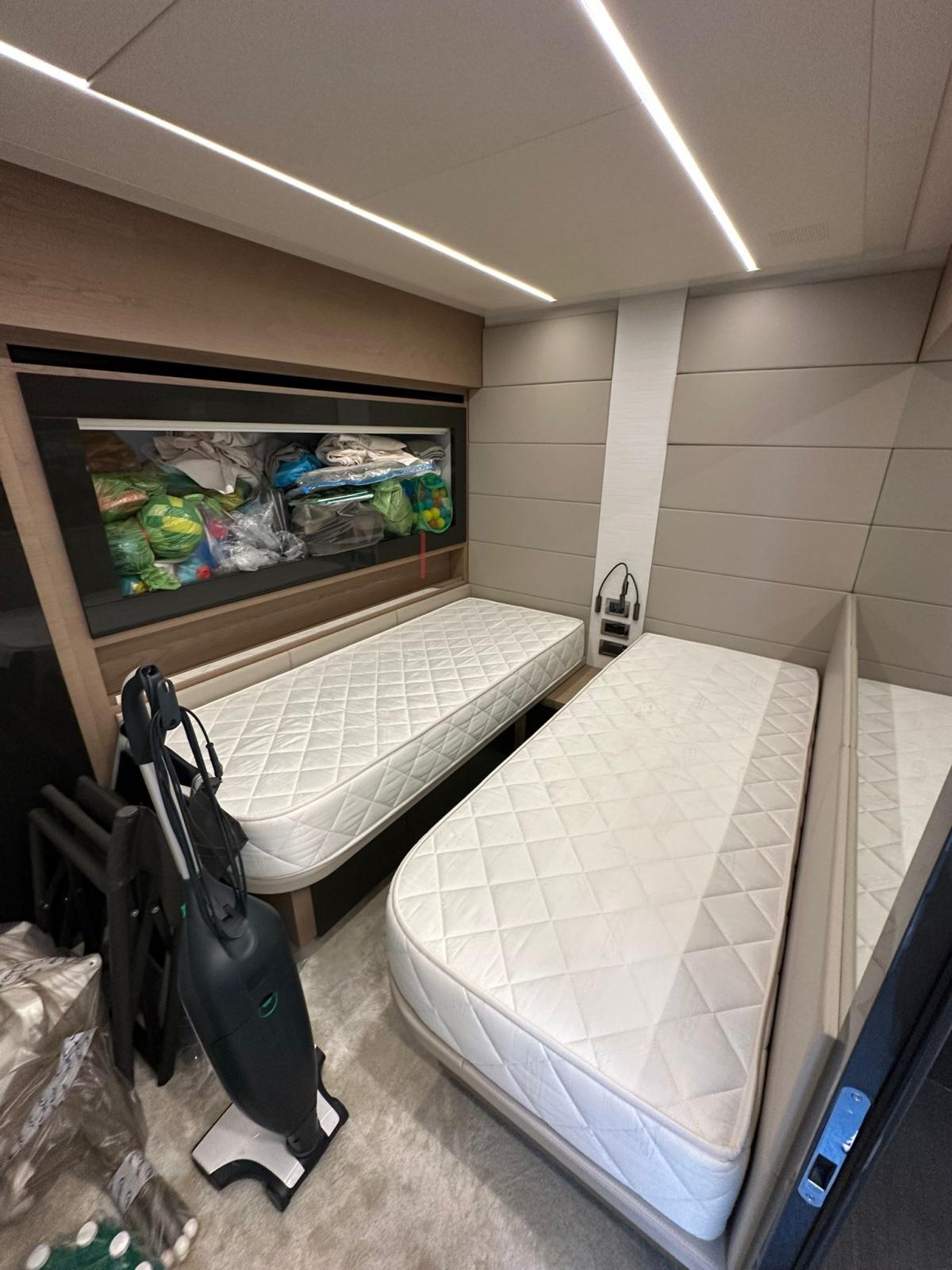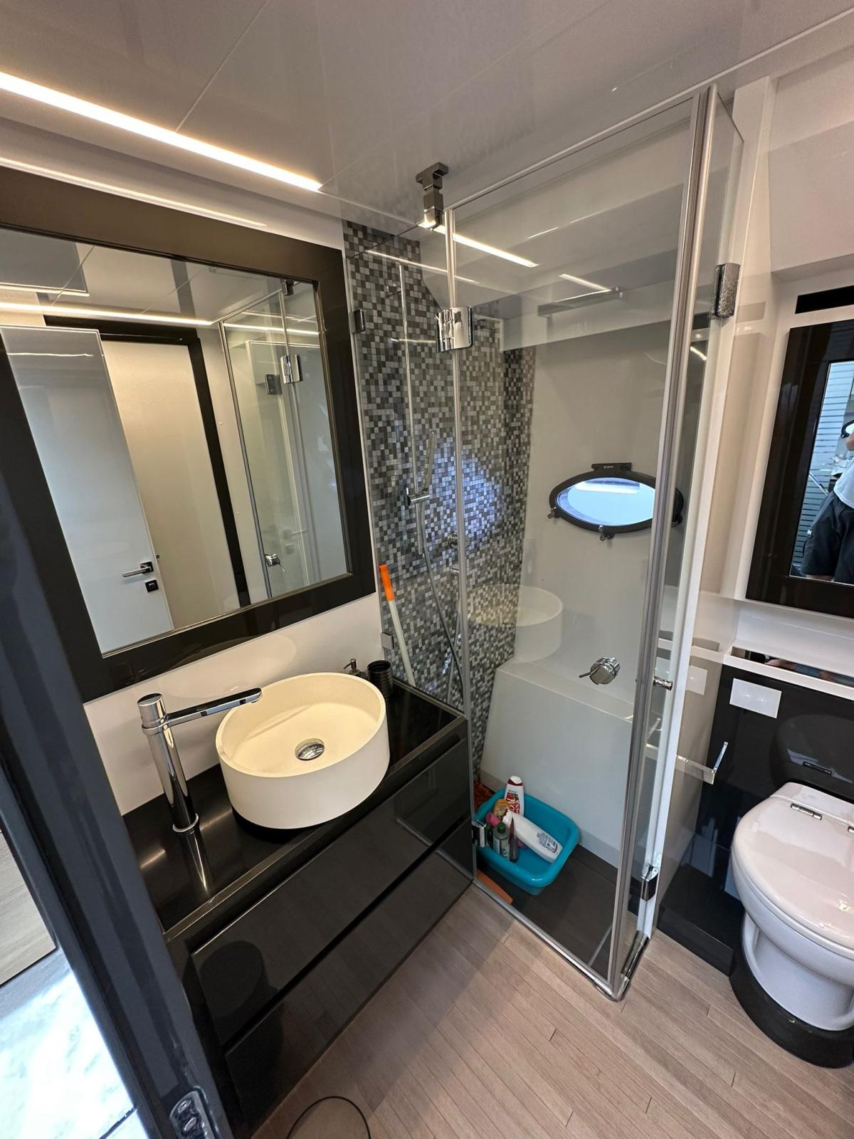 BBQ/ Grill, Ballon d'eau chaude, Coffre-fort, Air Conditionné, Connexion à internet, Dessalinisateur (IDROMAR 200 L/H), Cuve à eaux noires, 2 Convertisseur, Plancher intérieur en bois, Prises interieures 12v, Prises interieures 220v, Réservoir d'eau noire, 2 Caméra vidéo, 4 Toilettes électriques.