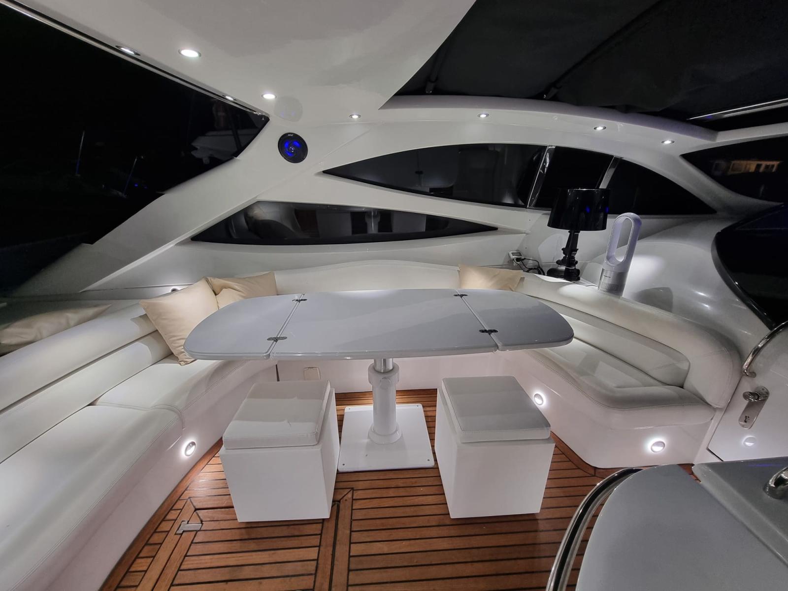 Alarme gaz, Alarme moteur, Alarme de pompe de cale, Ouverture du compartiment moteur électrique, Eau sous pression, Couleur spéciale, Douche de cockpit, Phare de poursuite, Flaps hydrauliques, Hard top, Extincteur(s) fixe(s), Indicateurs de flaps, Lavabo dans le cockpit, Éclairage de courtoisie, Spots sous-marins, Pompe de cale automatique, Pompe de cale manuelle, Cockpit en teck, Prise de quai, Guindeau électrique, Echelle de bain, Selles pour Annexe, table de cockpit, Table pliante de salon, Corne, Winch, Winch électrique arrière, Winch électrique avant.