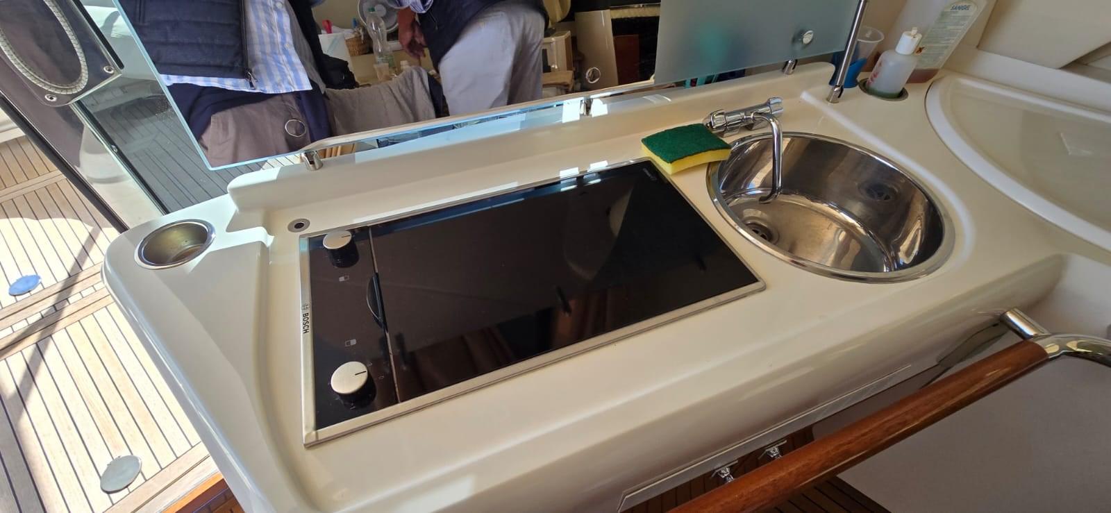 Alarme gaz, Alarme moteur, Alarme de pompe de cale, Ligne d'arbre de rechange, Eau sous pression, Passavant en teck, Douche de cockpit, Hard top, Extincteur(s) fixe(s), Pompe de cale automatique, Pompe de cale manuelle, Cockpit en teck, Prise de quai, Guindeau électrique, Corne.
