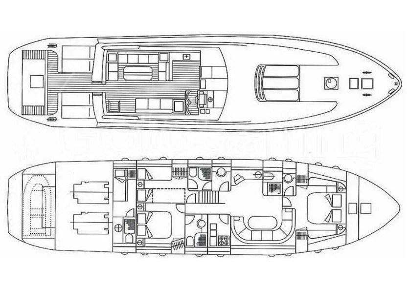 Cabine principale avec lit double et salle de bain - cabine VIP avec lit double et salle de bain - cabine d’amis avec deux lits plats, troisième lit Pullman et salle de bain.