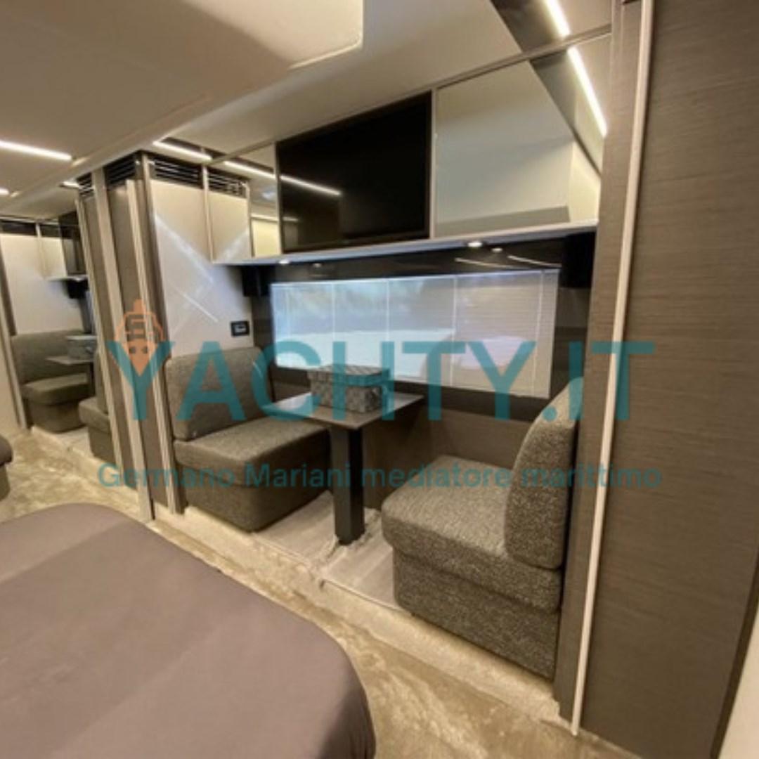Les intérieurs élégants et lumineux abritent un saloon raffiné sur la terrasse principale avec un canapé, une table et une armoire en forme de « C » avec télévision rétractable. Sous le pont, on trouve une cuisine entièrement équipée et une disposition pour dormir composée de trois cabines doubles et deux salles de bains avec douches, conçues pour garantir intimité et confort même lors de longues croisières.