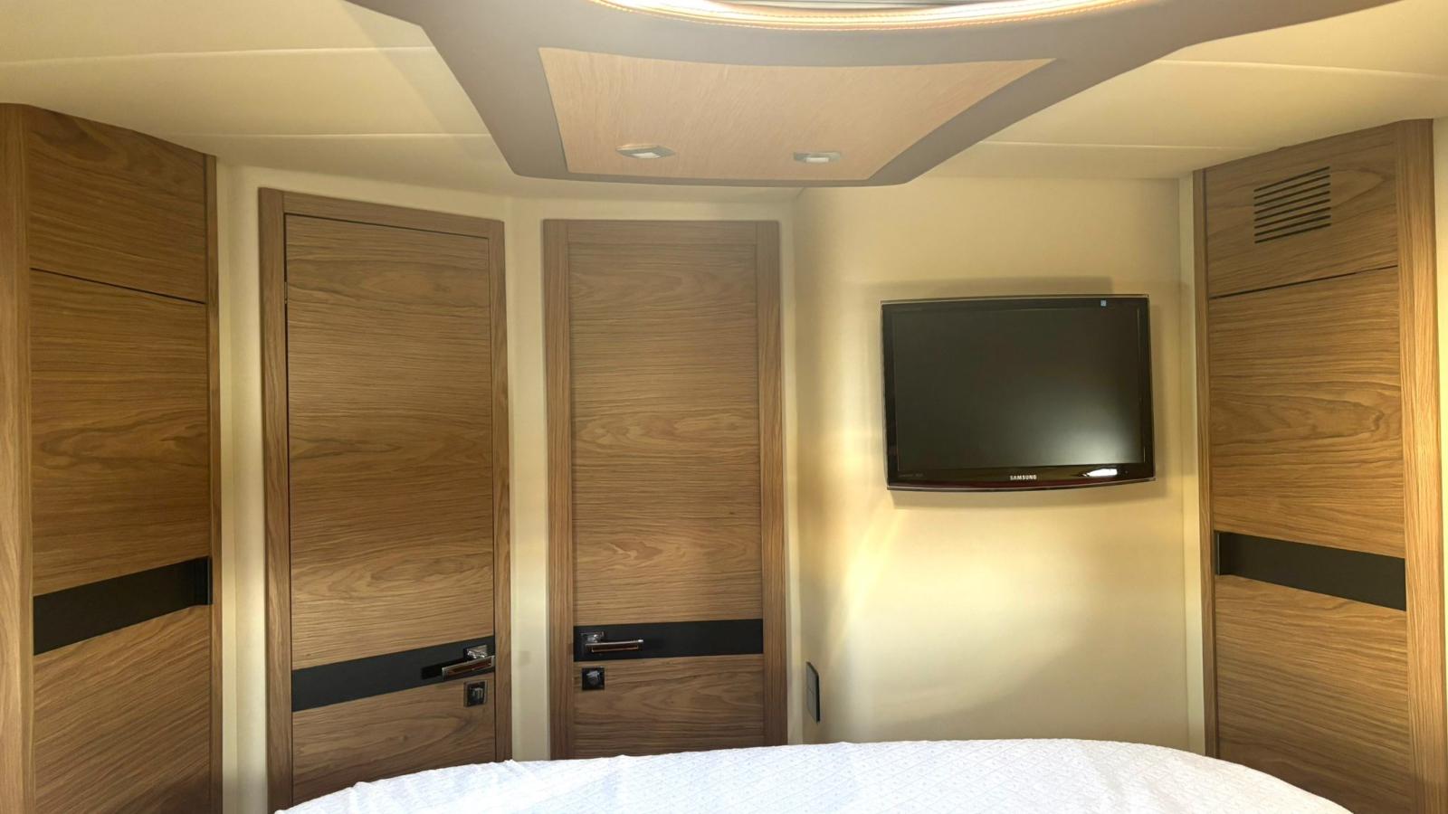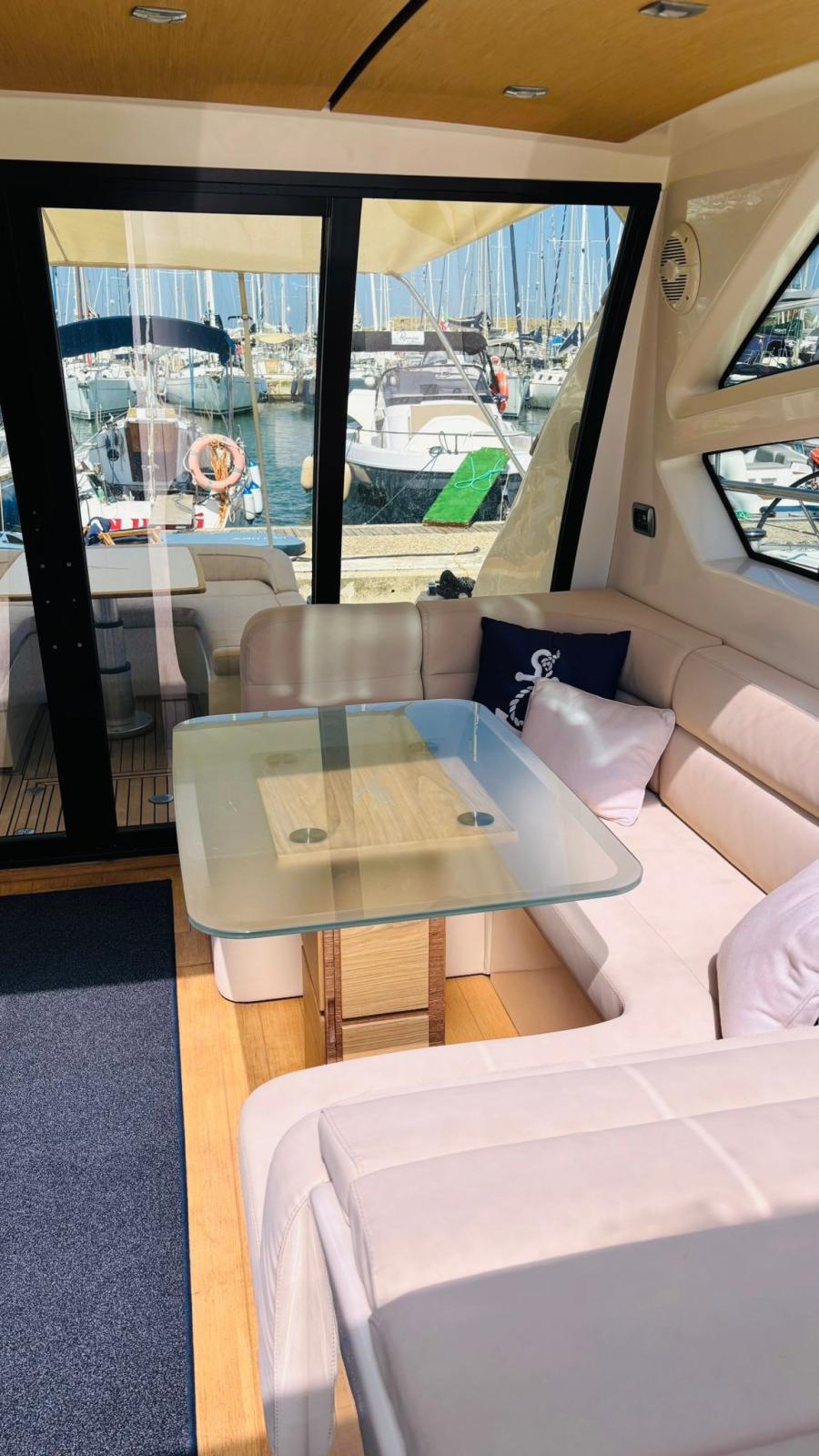 Alarme moteur, Alarme de pompe de cale, Alternateur, Eau sous pression, Passavant en teck, Câble d’alimentation à quai, Douche de cockpit, Phare de poursuite, Flaps hydrauliques (BENNET - CON INDICATORE DI POSIZIONE), Garage à annexe (Con apertura elettrica), Hard top, Spots sous-marins, 2 Panneau solaire (Montati sull’hard top), Passerelle, Pompe de cale automatique, Porte latérale, Cockpit en teck, Prise de quai, Guindeau électrique, table de cockpit, Annexe (Con fuoribordo Johnson 2,5).