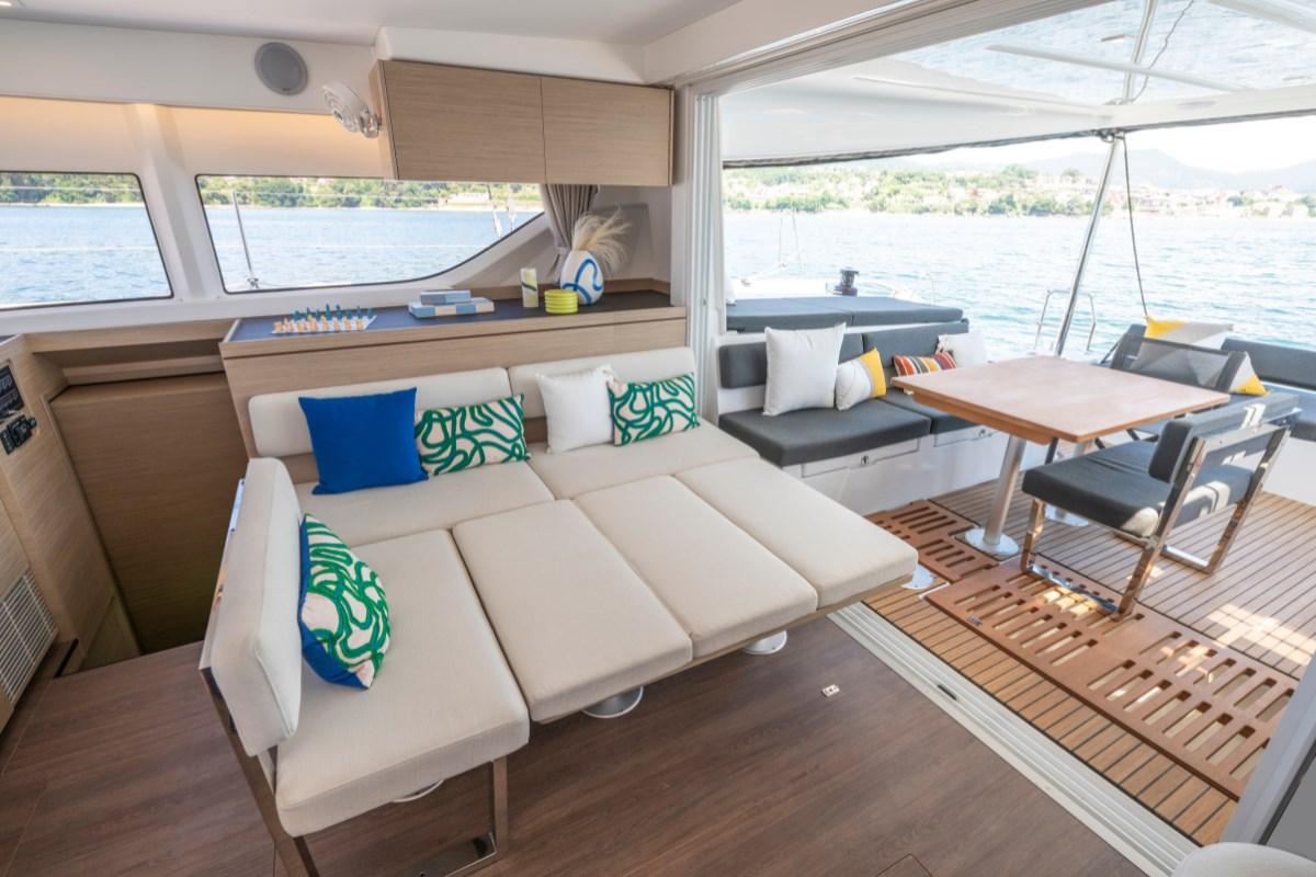 Lagoon a imaginé une nouvelle vision de la vie à bord, présentant un bateau polyvalent aux limites modulaires. Cette avancée du mât permet de transformer l’espace à bord du Lagoon 43, permettant de connecter l’intérieur et l’extérieur comme souhaité, créant une dimension unique entre le salon et le cockpit. Le processus est simple et rapide pour créer de nombreuses compositions, pouvant accueillir jusqu’à 12 personnes à la table. Un nouvel espace convivial a été inventé pour rencontrer et partager un moment en compagnie, avec la famille ou les amis
