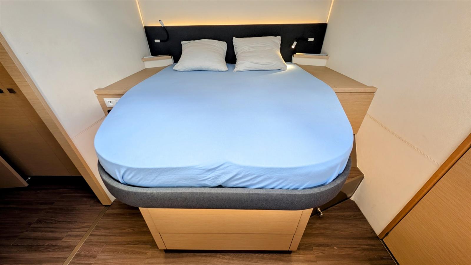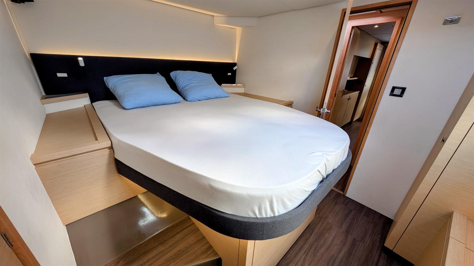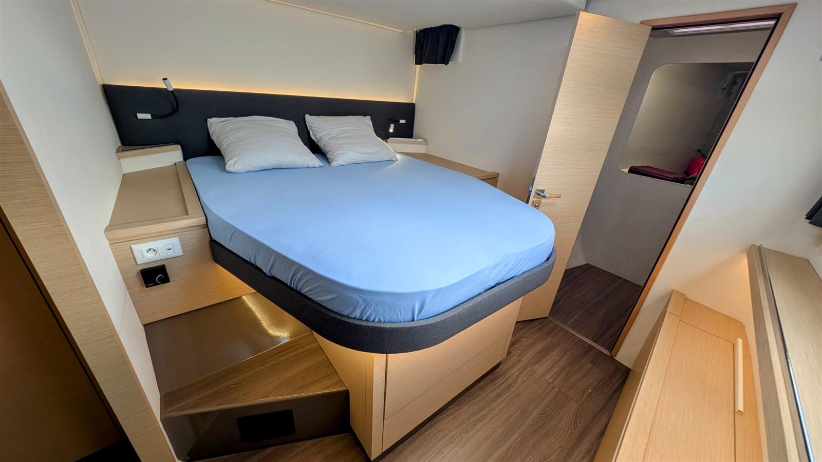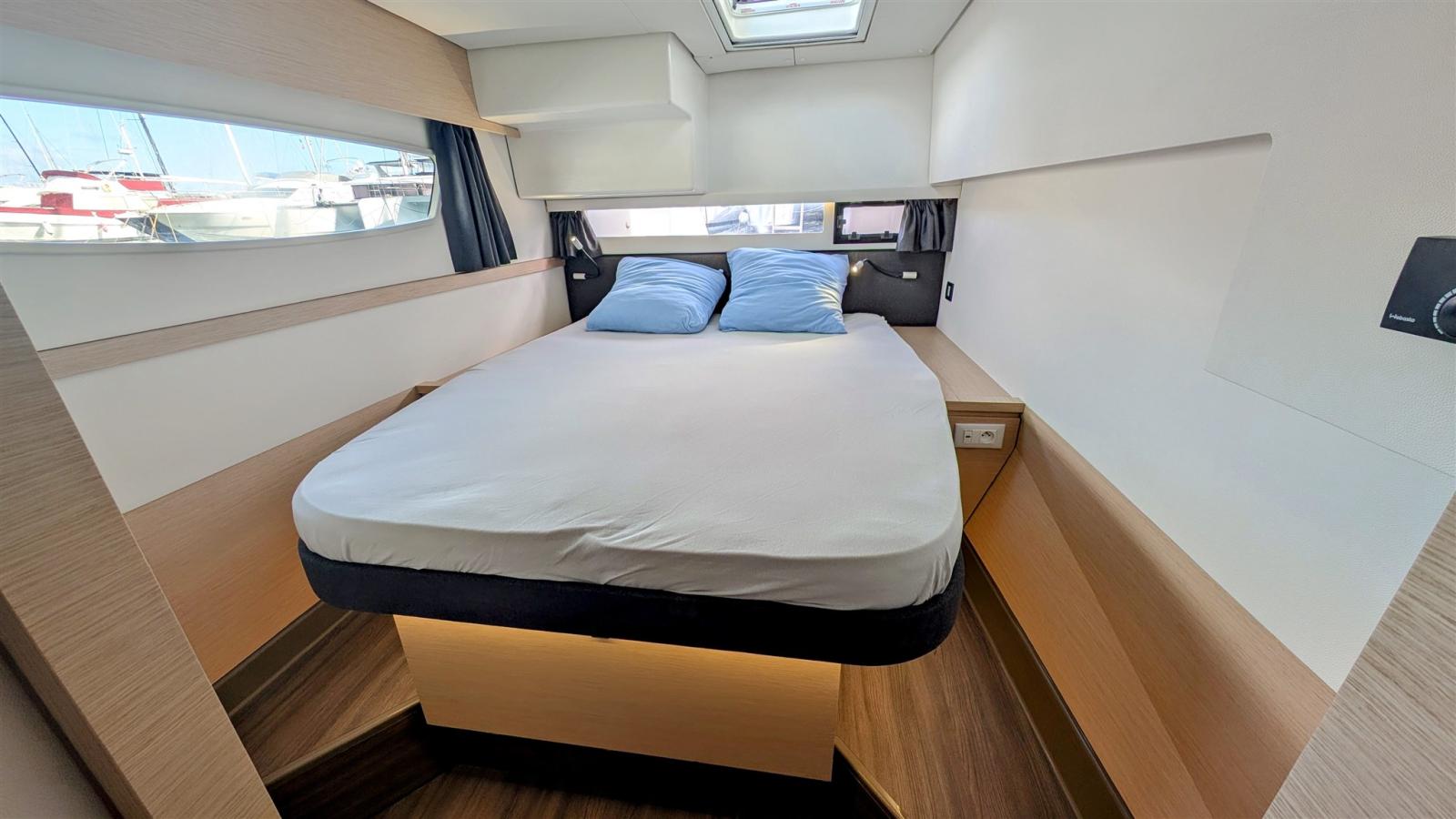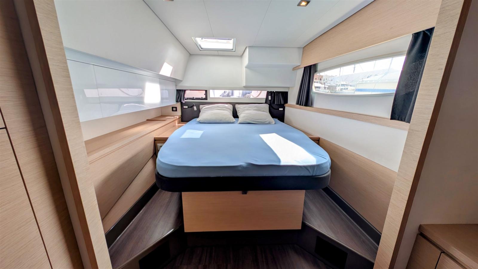 Signé par le chantier Fountaine Pajot, le Saba 50 incarne l’équilibre entre confort, performance et grande autonomie en croisière. Son carré panoramique, son cockpit spacieux et son flybridge offrent des espaces de vie lumineux et conviviaux. Les cabines, particulièrement spacieuses, disposent de nombreux rangements et participent au confort à bord, complétées par un local technique et de stockage à l’avant bâbord.