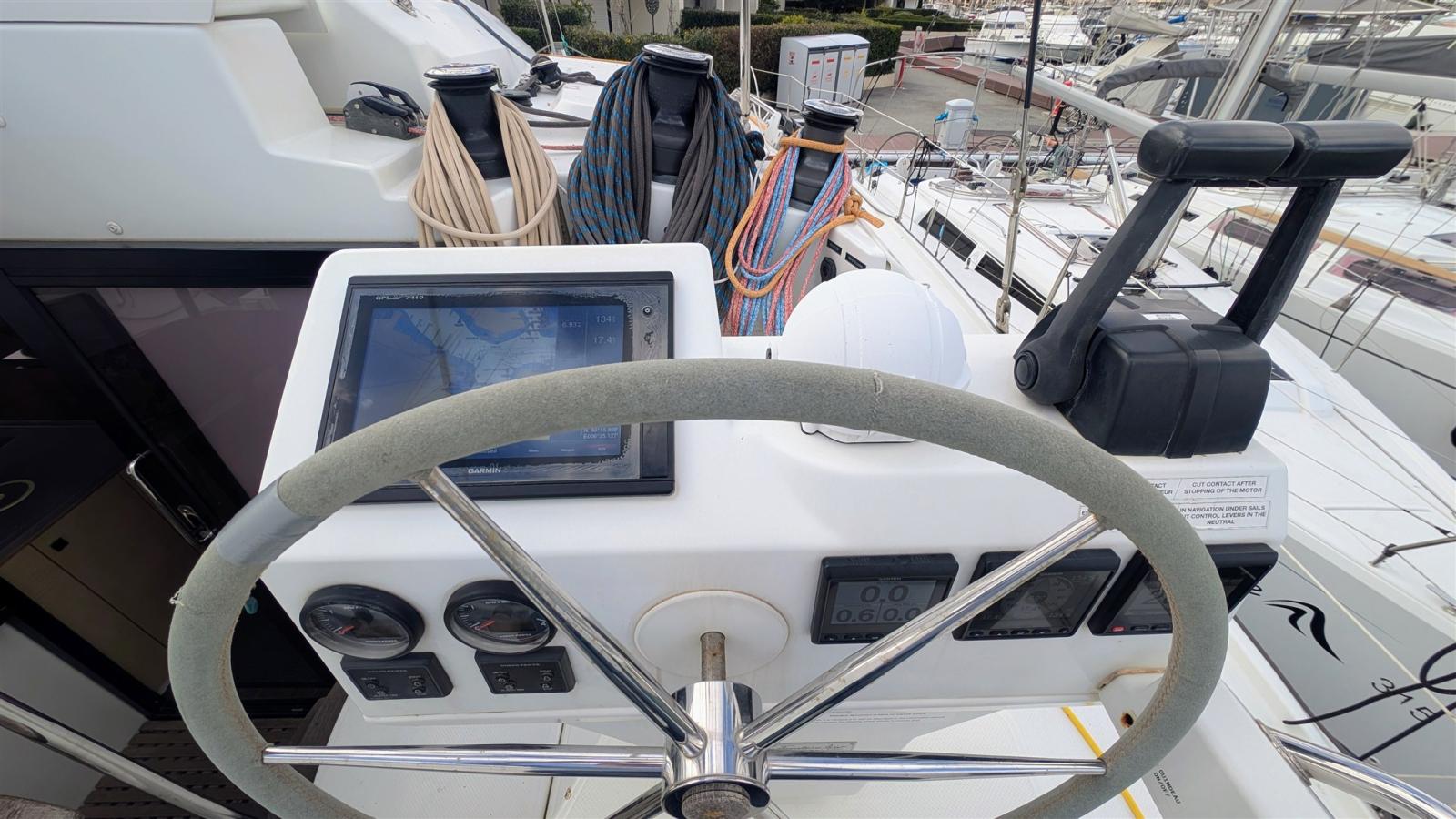 AIS (Garmin), Indicateur d'angle de barre, Compteur de chaîne, DSC VHF (Garmin), Balise de détresse (EPIRB), GPS (Garmin), Cartes et guides, 2 Lecteur de cartes (Garmin), Panneau de commande, Radar (Garmin), Radio VHF (Garmin), Sondeur (Garmin).