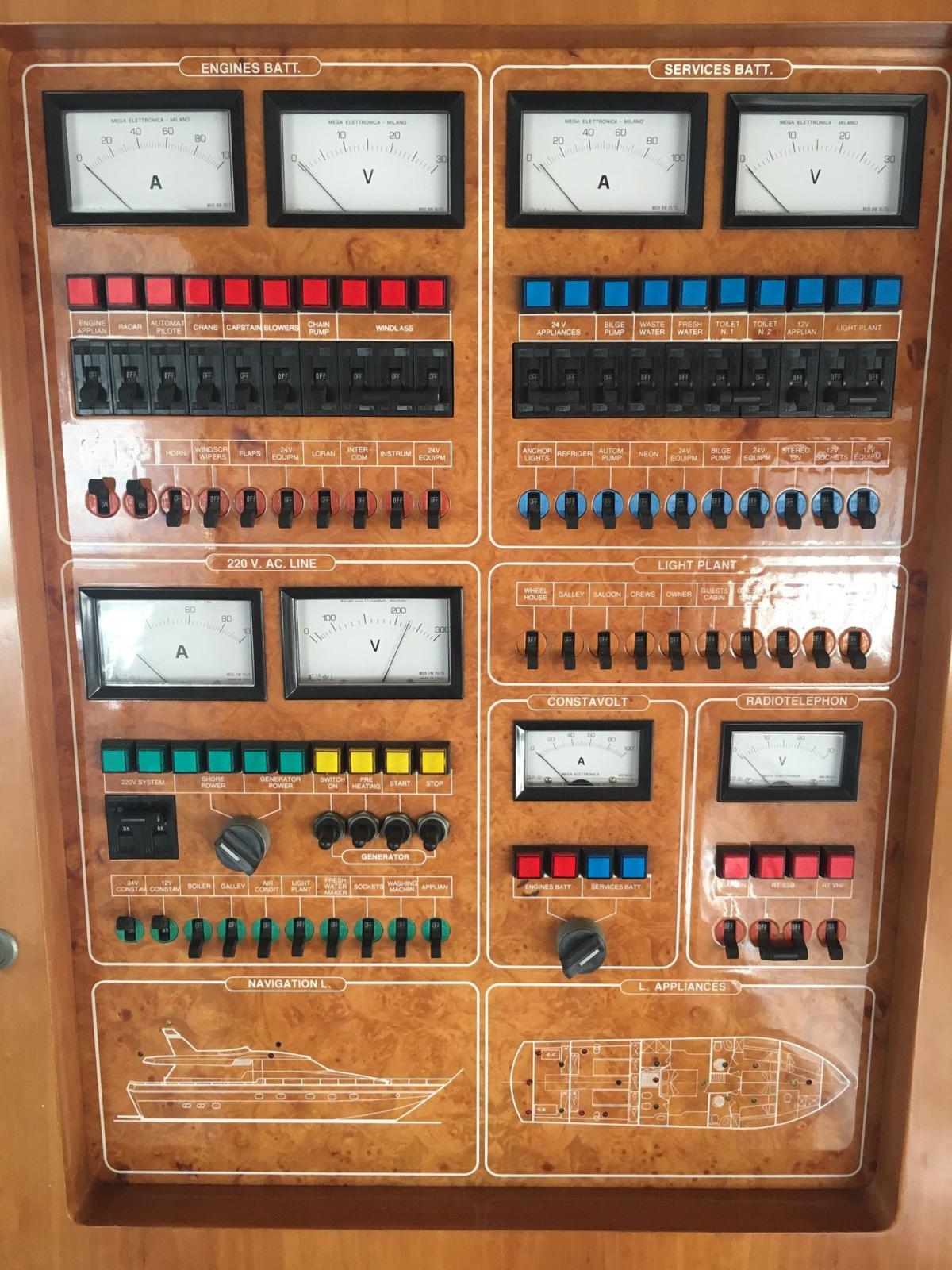 Alarme moteur, Alarme de pompe de cale, Eau sous pression, 5 Batteries, Passavant en teck, Douche de cockpit, Flaps hydrauliques, Indicateurs de flaps, Lavage de chaine, Panneau solaire, Passerelle, Plateforme arrière, Pompe de cale manuelle, Porte latérale, Porte latérale, Cockpit en teck, Prise de quai, Connexion eau sous pression à quai, Onduleur, Guindeau électrique, Echelle de bain, table de cockpit, Annexe, Corne.