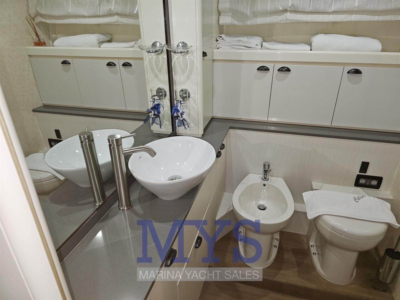 Alarme moteur, Douche de cockpit, Double barre à roue, Flaps hydrauliques, Grue de flybridge, Extincteur(s) fixe(s), Indicateurs de flaps, Lavage de chaine, Éclairage de courtoisie, Spots sous-marins, Passerelle, Plateforme arrière, Pompe de cale automatique, Porte latérale, Porte latérale, Cockpit en teck, Prise de quai, Connexion eau sous pression à quai, Onduleur, Répétiteur électronique, Rollbar, Guindeau électrique, Echelle de bain, table de cockpit, Corne.