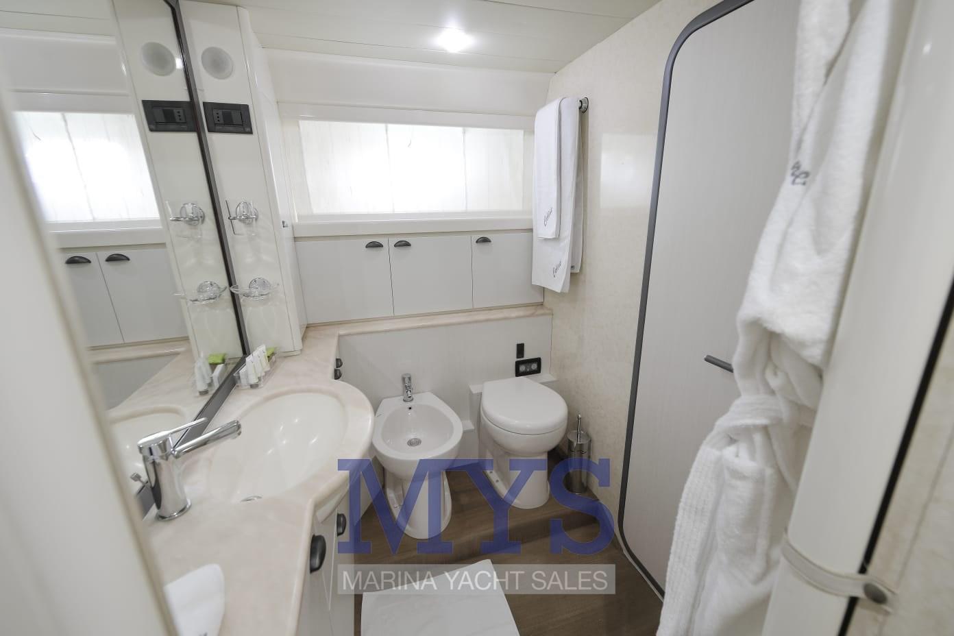 1 cabine double principale au centre du navire avec salle de bain attenante avec lavabo, douche, bidet et toilettes marines électriques