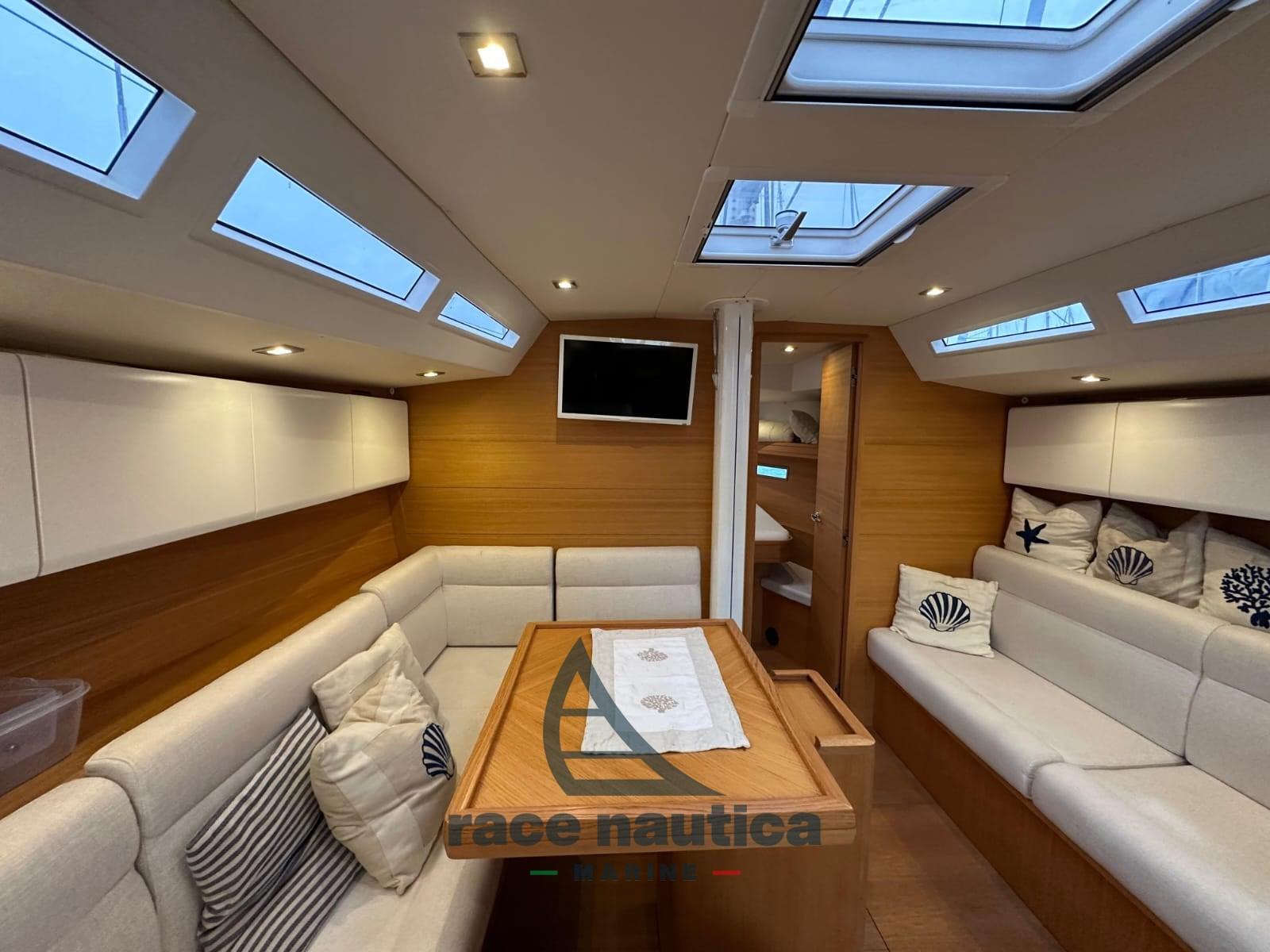 Disposition 2 cabines + 1 salle de bain, intérieur en chêne avec unités murales peintes en blanc, planchers en chêne à grain croisé et table à cartes à l’avant. Cloisons principales et avant composites, longerons composites et cloisons entièrement recouvertes de résine sur toute la coque et le pont sans moulures. Kquille en fonte avec poids en plomb, compartiment moteur fini en aluminium blanc perforé, ligne de flottaison et garnitures peintes en anthracite, fenêtres fixes en verre trempé à double vitrage, 2 fenêtres fixes supplémentaires, 4 trappes affleurantes et anti-encrassement.