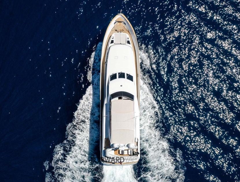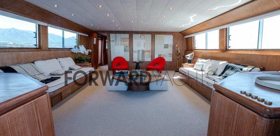 Le yacht est divisé en trois ponts : la passerelle arrière mène à un grand cockpit. Les passerelles latérales mènent à la proue par un grand solarium équipé d’un grand canapé-lit.