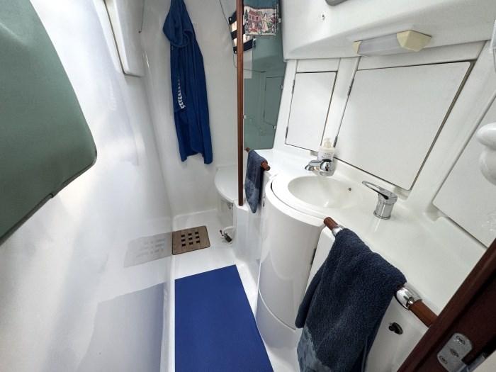 Alarme moteur, Douche de cockpit, Hélice de rechange, Plateforme arrière, Pompe de cale manuelle, Pont en teck, Cockpit en teck, Prise de quai, Guindeau électrique (50 mt catena), Echelle de bain, table de cockpit, Annexe.