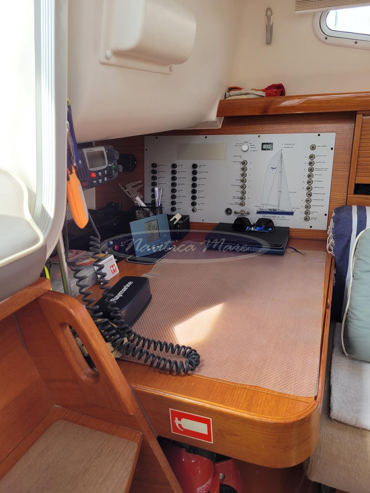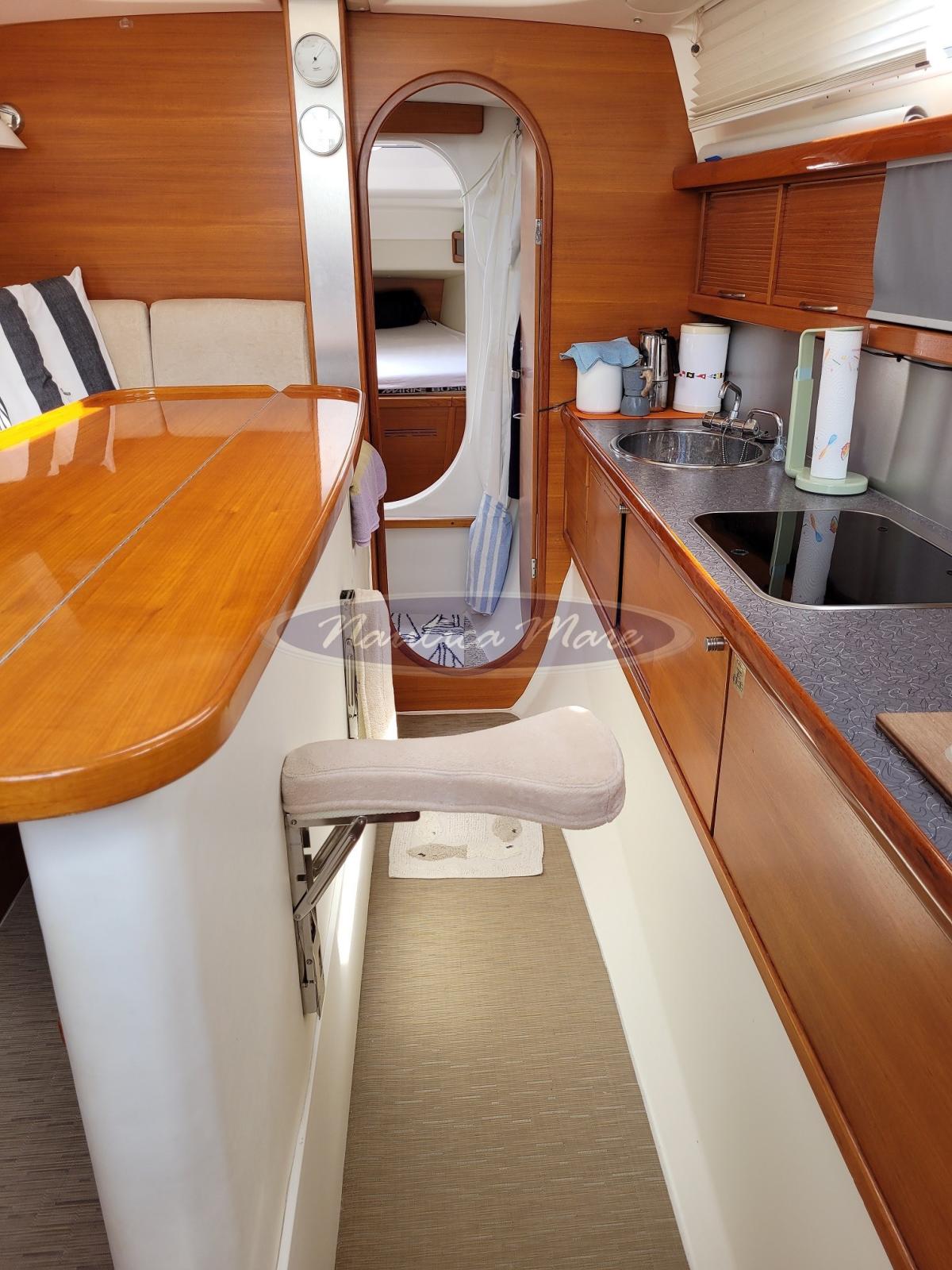 2 Ancre (Spade 7 kg. in alluminio con 13 kg. di catena da 8 mm. calibrata e 37 mt. di cima. Grappino Malingri inox smontabile 12 kg), Eau sous pression, 4 Batteries (70 Ah AGM), Chargeur de batterie (Mastervolt), Douche de cockpit, Propulseur d'étrave (4 kW a scomparsa), Moteur hors-bord pour annexe (2,5 hp), 3 Panneau solaire (Solbian 2 x 100 W + 1 x 56 W con regolatore), Prise de quai, Guindeau électrique (Quick 1000 W), Gréement monotoron (in Dyform originale (sostituito strallo di prua)), Echelle de bain, Annexe (con motore fuoribordo Honda 2,5 hp), 4 Winch (2 Andersen da 36 self tailing per fiocco, 2 per trasto randa da 30 self tailing), Winch électrique (Andersen da 46).