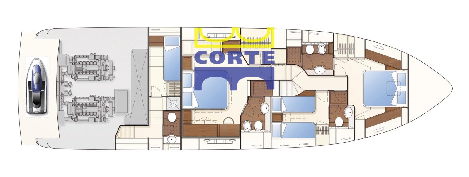 Très bon état. 3 cabines, 3 salles de bain, cabine d’équipage avec salle de bain.