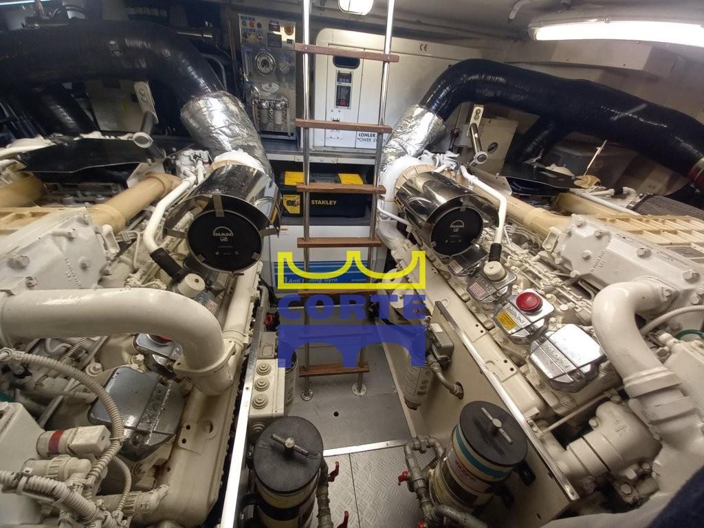 Alarme gaz, Alarme moteur, Alarme de pompe de cale, Ancre (Bruce e catena 75 m), Eau sous pression, Câble d’alimentation à quai, Douche de cockpit, Double barre à roue, Flaps hydrauliques, Bossoirs pour annexe (passerella), Extincteur(s) fixe(s), Compresseur de plongée, Lavabo dans le cockpit, Éclairage de courtoisie, Spots sous-marins, Moniteur de batterie, 2 Passerelle (elettroidraulica e passerella pieghevole con candelieri), Plateforme arrière (di poppa), Pompe de cale automatique, Pompe de cale manuelle, Porte latérale, Porte latérale, Cockpit en teck, Prise de quai, Connexion eau sous pression à quai, Répétiteur électronique, Rollbar, Guindeau électrique, Echelle de bain, Stabilisateurs (Arg Mitsubishi), table de cockpit, Corne, 2 Winch électrique arrière, Winch électrique avant.