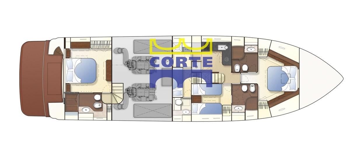 En passant sous le pont, sur la droite, se trouve la cabine d’invités avec des lits jumeaux et une salle de bain avec double accès depuis la cabine et le couloir. À l’avant se trouve la cabine VIP avec salle de bain privée. Sur la gauche, cependant, se trouve la cuisine. Depuis la cuisine, il est possible d’accéder au logement du marin puis à la salle des machines entre ce dernier et la cabine propriétaire