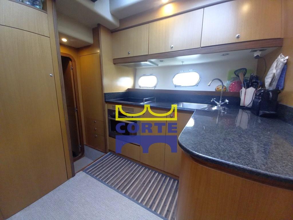 stabilisateurs gyroscopiques, troisième poste de pilotage dans le cockpit, plate-forme arrière en teck (élévateur d’annexe), table télescopique à l’avant avec bain de soleil, lumières étanches sous la plate-forme, ouverture latérale de la chaire, doubles stores romains dans le salon, éclairage de la passerelle latérale, TV LCD 26" avec ascenseur électrique, congélateur à tiroirs, haut-parleurs amplifiés par paires sur le flybridge, dôme vide, hotte aspirante au-dessus des brûleurs de cuisine, housses de coussin externes complètes de couleur rouf.