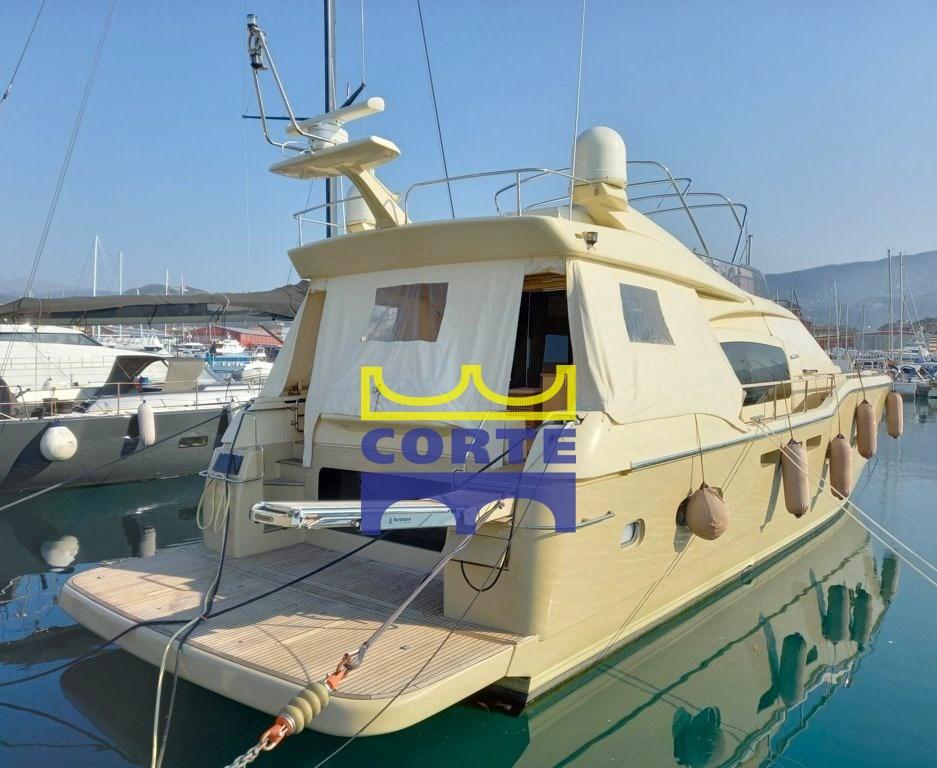 Alarme moteur, Alarme de pompe de cale, Eau sous pression, Passavant en teck, Couleur spéciale, Douche de cockpit, Double barre à roue, Phare de poursuite, Flaps hydrauliques, Extincteur(s) fixe(s), Indicateurs de flaps (sul fly), Éclairage de courtoisie (camminamenti laterali), Spots sous-marins (sotto la plancetta di poppa), Passerelle (elettroidraulica a scomparsa), Plateforme arrière (poppa in teak con tender lift), Pompe de cale automatique, Porte latérale, 2 Porte latérale, Cockpit en teck, Prise de quai, Connexion eau sous pression à quai, Guindeau électrique, Echelle de bain, Stabilisateurs (giroscopici Mitsubihi), table de cockpit (con vano per 4 sedie), Corne, 2 Winch électrique arrière, Winch électrique avant.