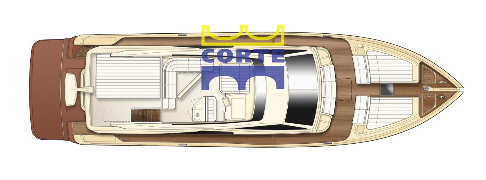 Deux bains de soleil ont été positionnés sur le flying bridge, l’un très large vers la poupe et l’autre vers la proue à côté du poste de barre. Un canapé en forme de L, une table fixe et un coin réfrigérateur et grill complètent le double-toit.
