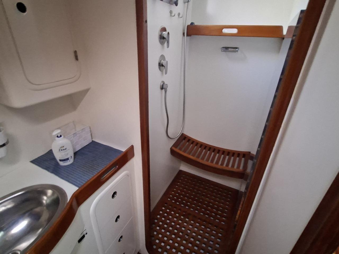 Une salle d’eau avant tribord équipé d’une douche, d’un lavabo et d’un toilette électrique a eau douce