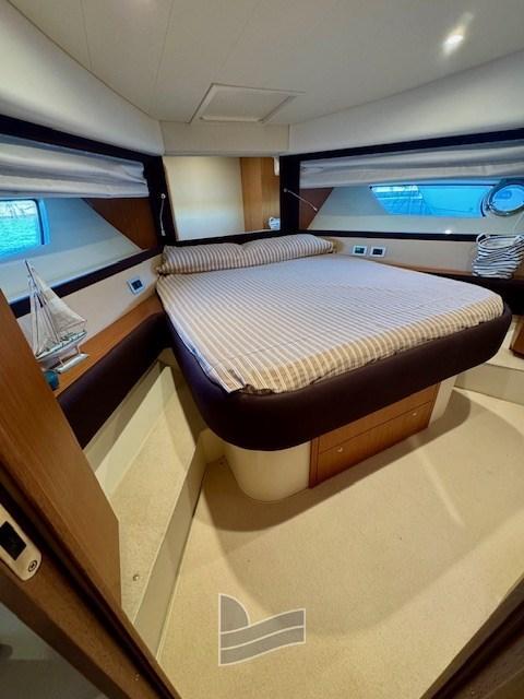 À bord, à droite, se trouve la cuisine parfaitement équipée, positionnée à l’arrière, conçue pour un propriétaire qui fait l’expérience directe du bateau. À gauche, un box de rangement confortable avec des portes et aussi à gauche un grand canapé d’angle, très profond et équipé d’une table haute extensible, pouvant accueillir jusqu’à 6 personnes ; En avant de la cuisine, il y a un autre canapé à double siège, l’espace couchage est proposé à des solutions normalement adaptées aux grands bateaux, avec trois cabines doubles, deux avec un lit double et une avec deux lits simples.