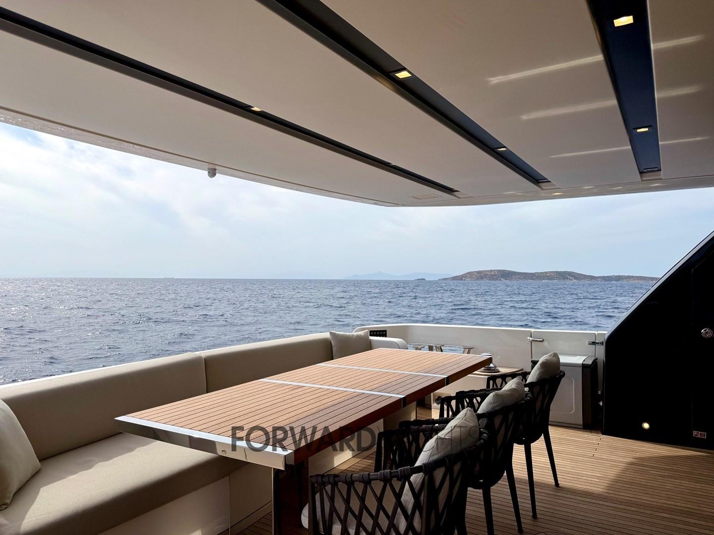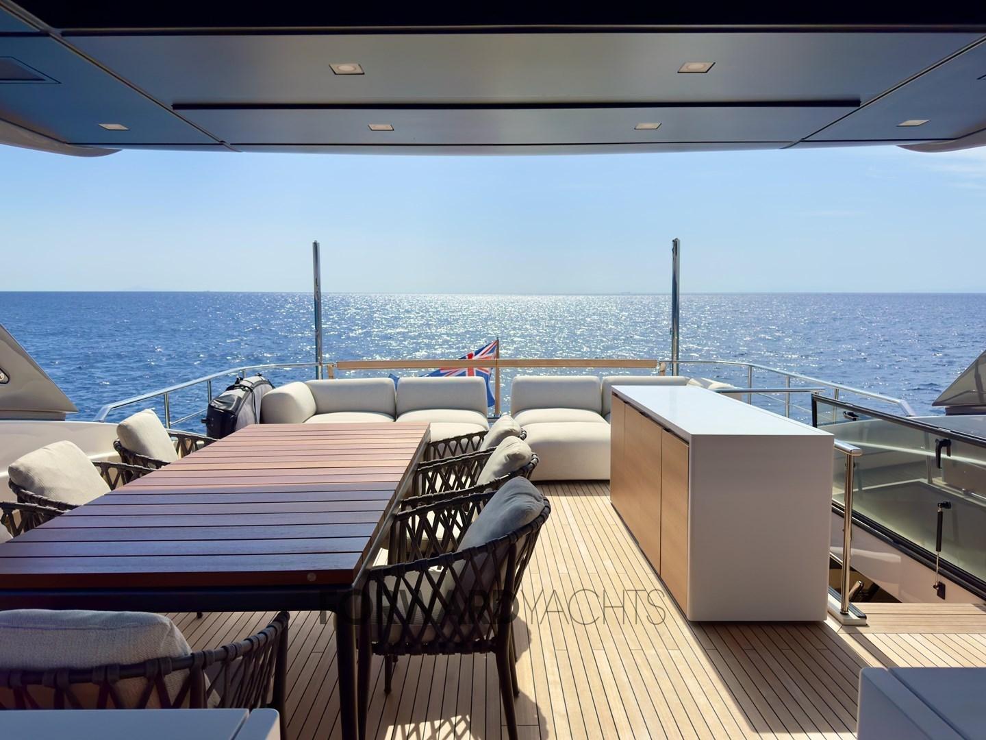 équipé d’un salon meublé par Minotti avec refroidisseur à vin et d’un grand flybridge complet avec un bar et