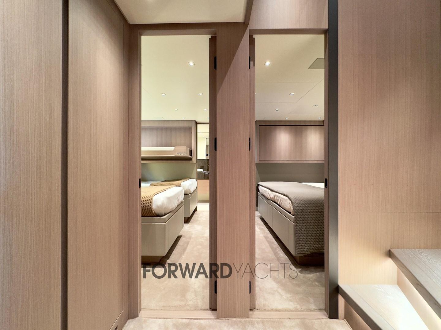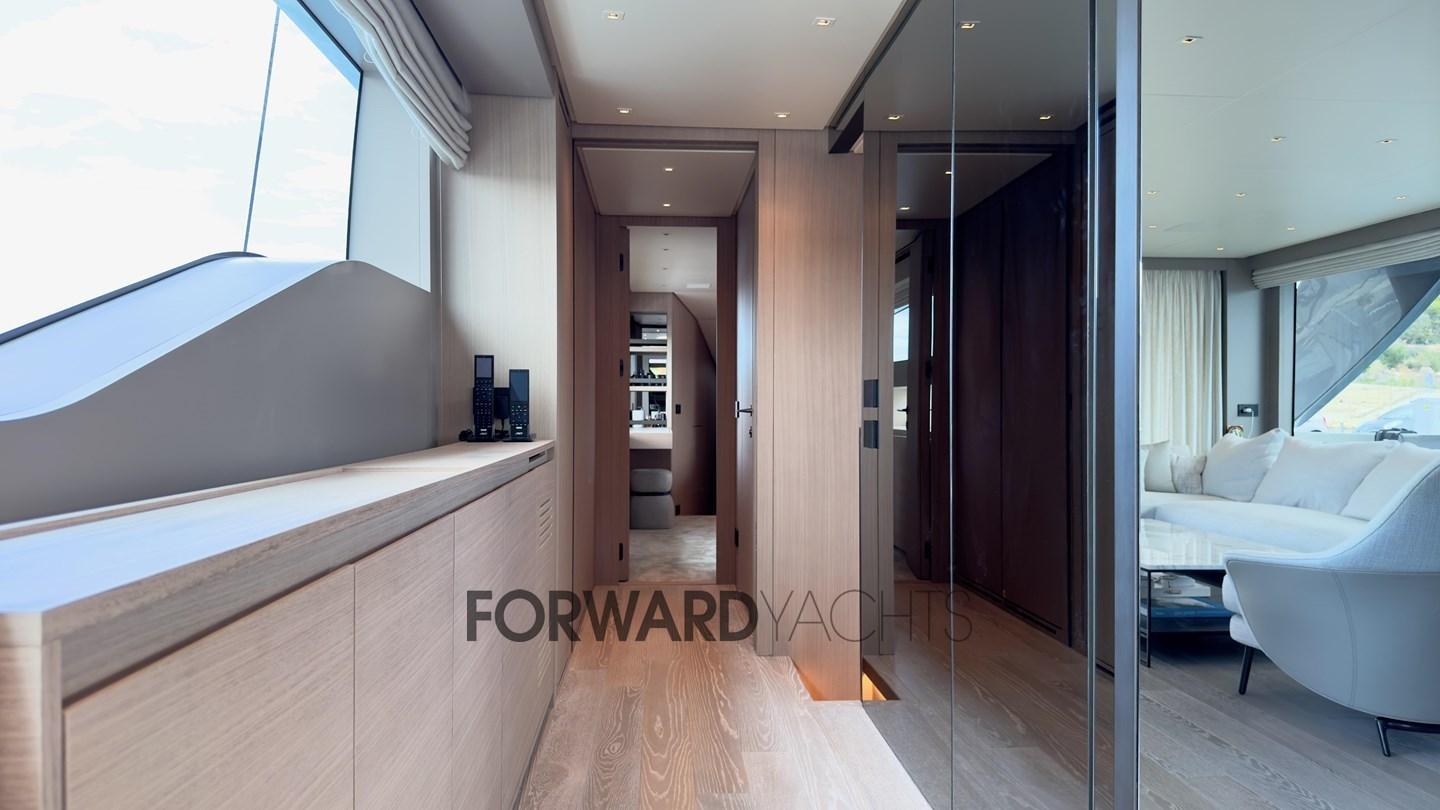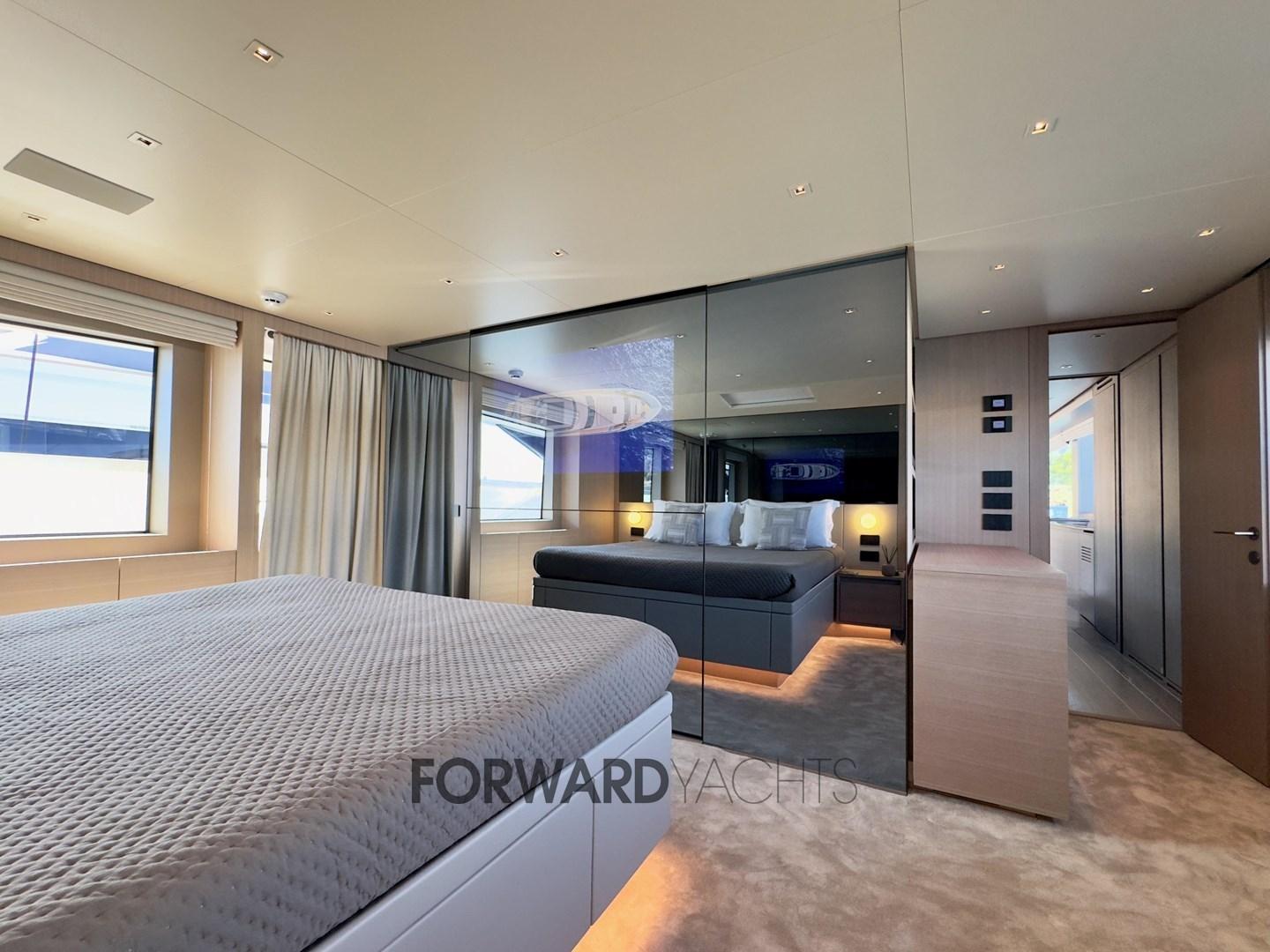 La suite du propriétaire, située sur le pont principal, dispose d’un grand dressing et d’un accès