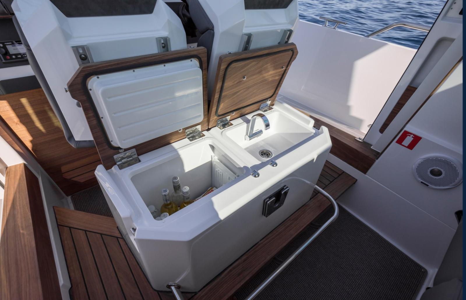 Alarme moteur, Eau sous pression, Couleur spéciale (Grey Hull), Douche de cockpit, Phare de poursuite, Éclairage de courtoisie, Cockpit en teck, Prise de quai, Guindeau électrique, Stabilisateurs (Quick), table de cockpit.