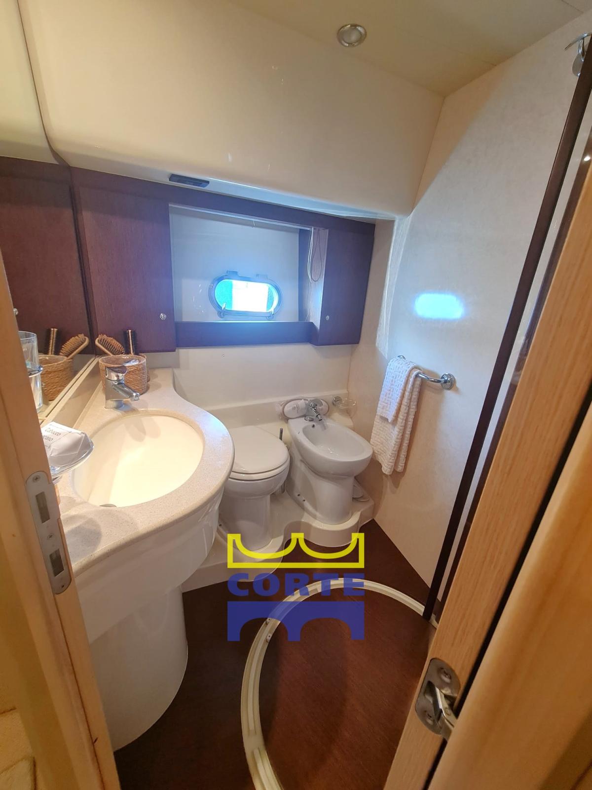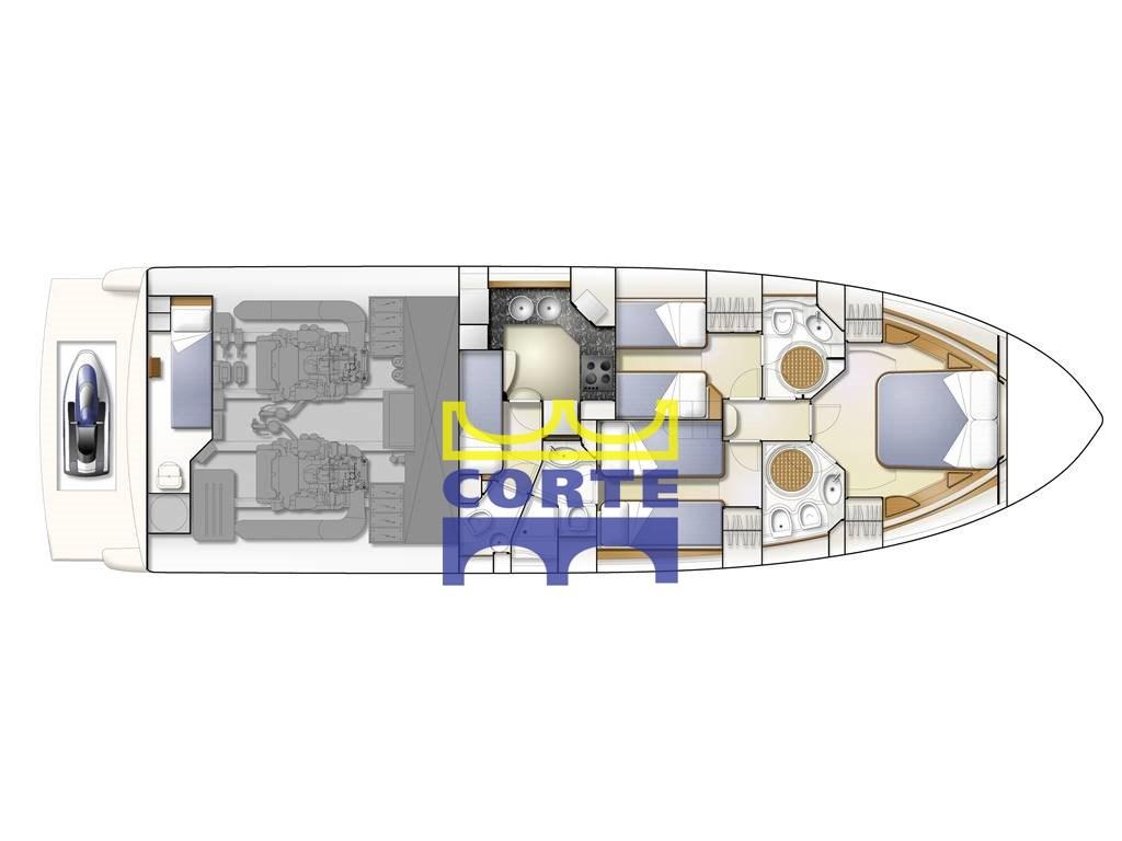 Cabine propriétaire à l’avant avec salle de bain ; Cabine d’invités gauche avec lits plats avec salle de bain ; Cabine d’invités droite avec lits plats avec salle de bain et cabine de douche séparée ; Cabine intérieure de l’équipage avec salle de bain séparée ; Cabine d’équipage arrière avec salle de bain.