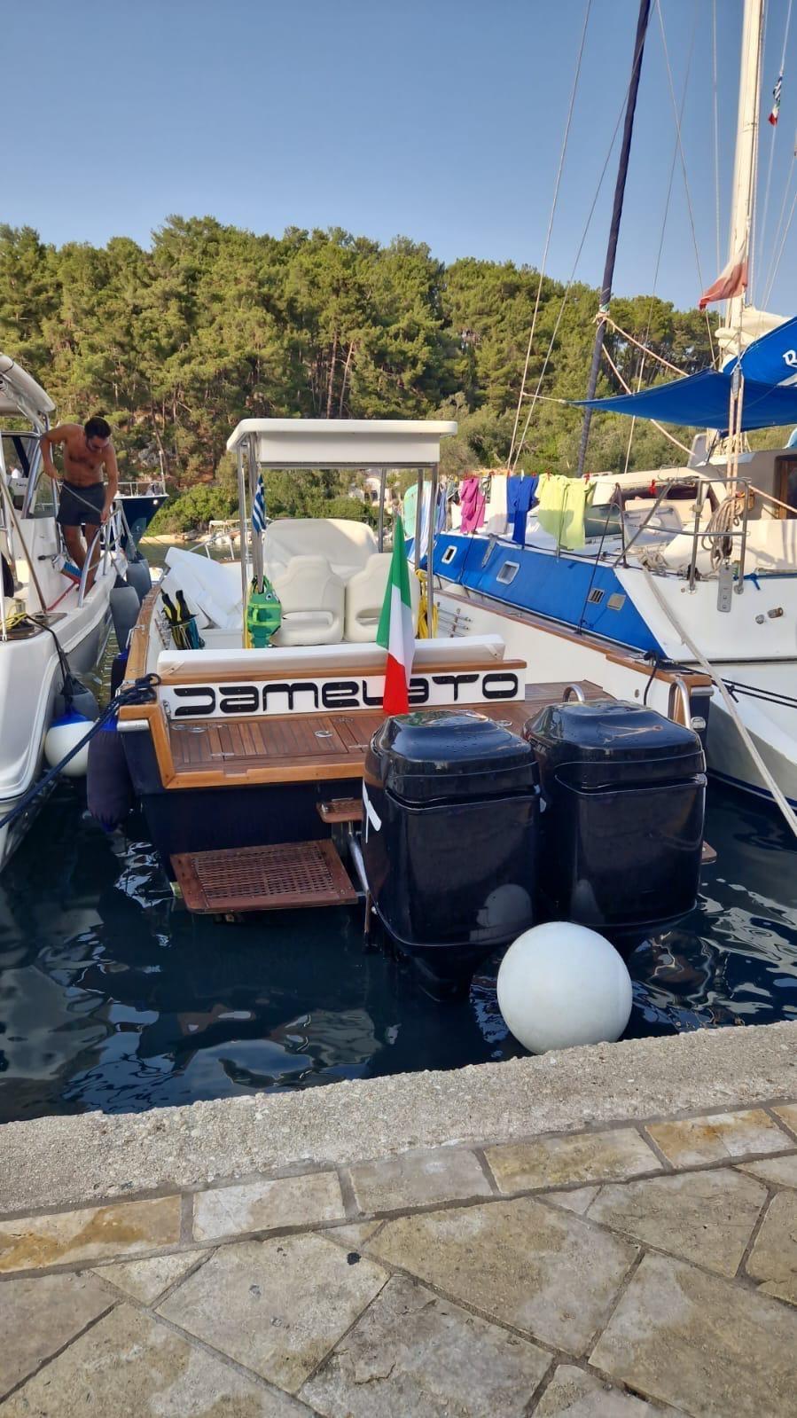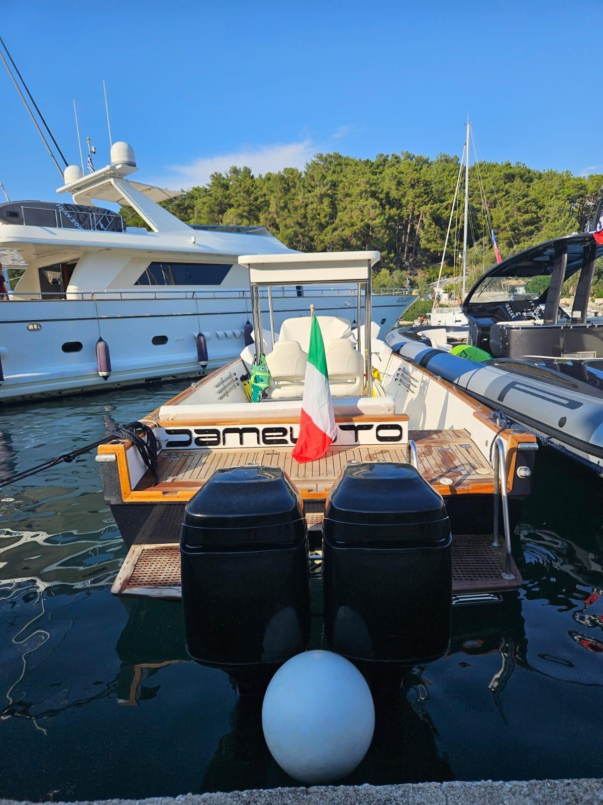 Le splendide Tecnomar 38 FB, un bateau emblématique au caractère sportif, entièrement reconditionné en 2024 grâce à des interventions réalisées de manière professionnelle dans les célèbres chantiers navals des défenses Molfetta.