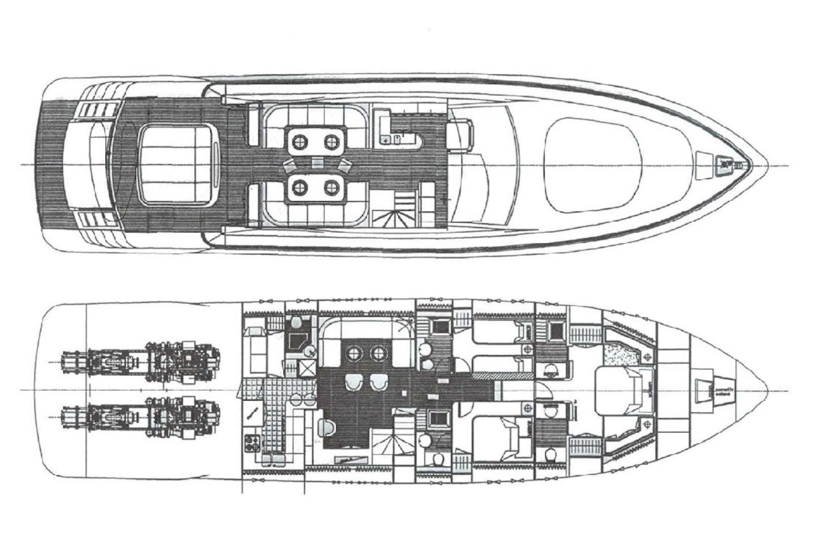 Cabine principale avec lit double et salle de bain - cabine VIP avec lit double et salle de bain - cabine d’amis avec deux lits au sol - cabine simple - salle de bain d’invités.