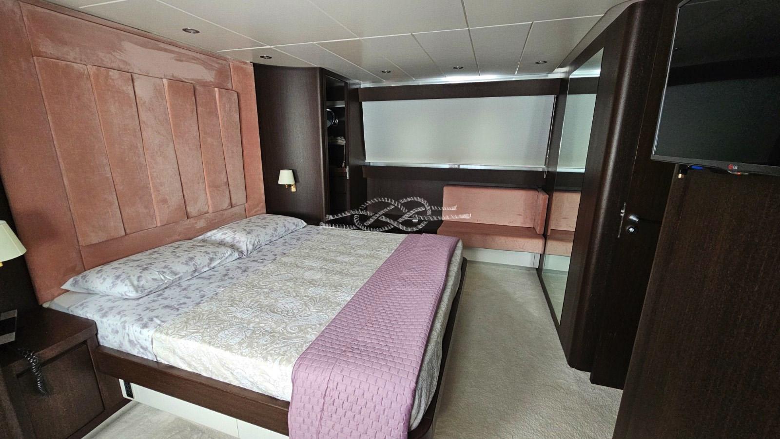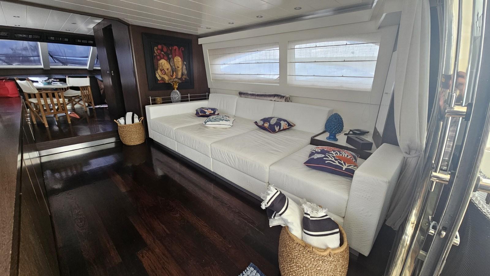 Alarme moteur, Alarme de pompe de cale, Eau sous pression, Système de vidange, Passavant en teck, Douche de cockpit, Double barre à roue, Phare de poursuite, Flaps hydrauliques, Grue de flybridge, Extincteur(s) fixe(s), Indicateurs de flaps, Lavage de chaine, Éclairage de courtoisie, Passerelle, Prise de quai, Connexion eau sous pression à quai, Onduleur, Guindeau électrique, Echelle de bain, table de cockpit, Corne, Winch électrique arrière.