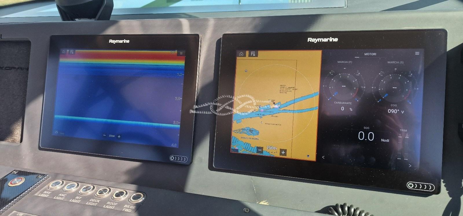 Radar Doppler Raymarine - 2 traceurs Raymarine 12" à cartes tactiles - Sonar 3D Raymarine avec transducteur en bronze - VHF Raymarine.