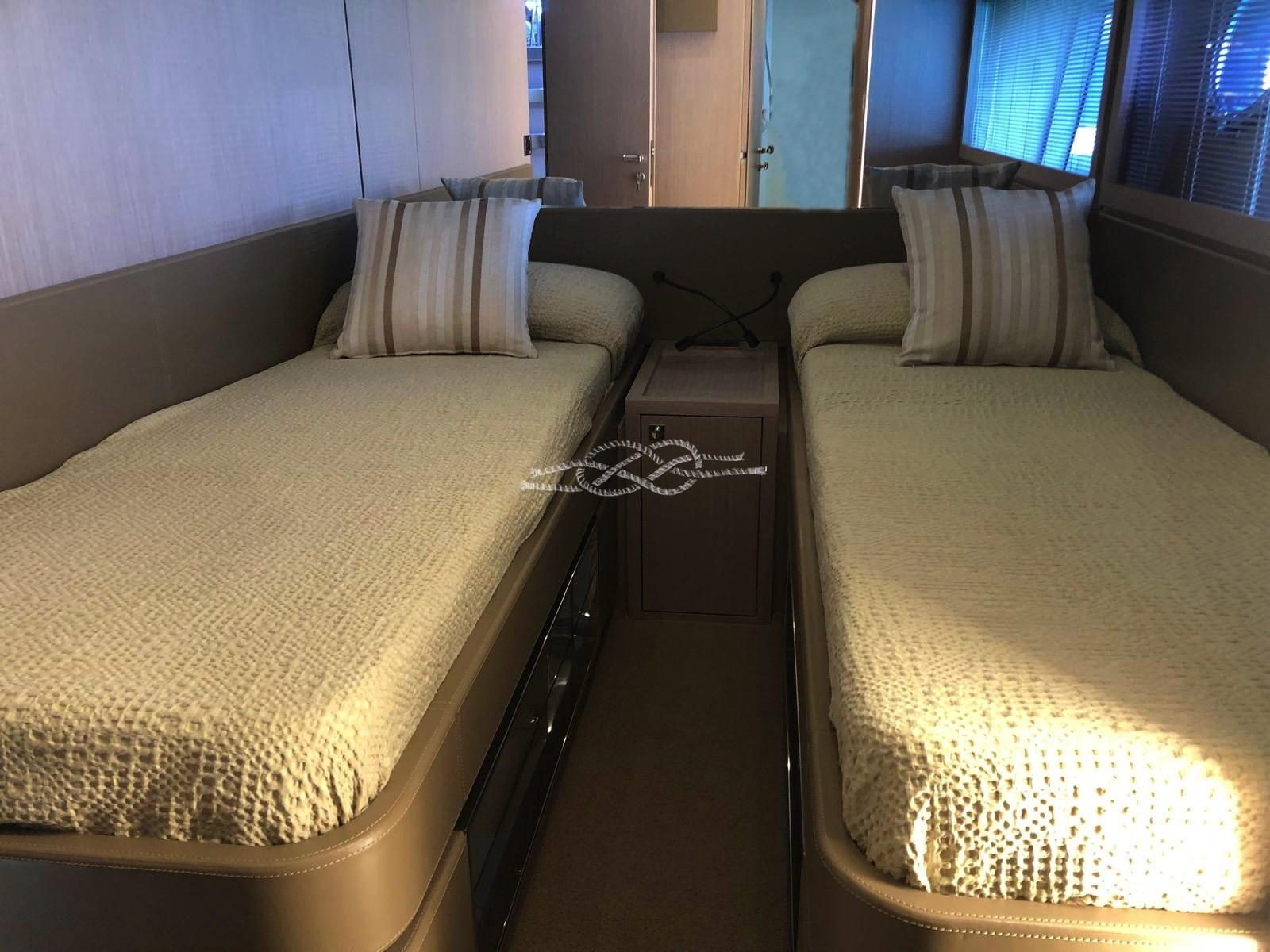 Cabine principale avec lit double, dressing, salle de bain - cabine VIP avec lit double et salle de bain - cabine d’invités avec lit double et salle de bain - cabine d’invités avec deux lits plats - salle de bain invités.