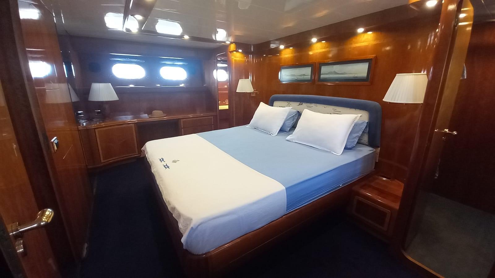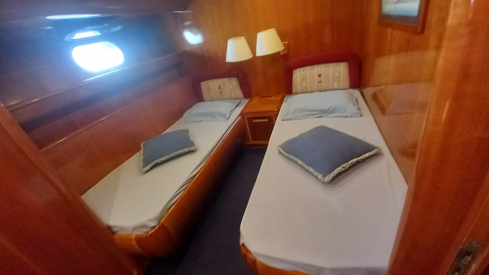 Cabine principale avec lit double, dressing et salle de bain avec douche séparée - Cabine VIP avec deux lits plats et salle de bain - Cabine invités avec deux lits plats et salle de bain - Cabine invités avec deux lits plats et salle de bain.