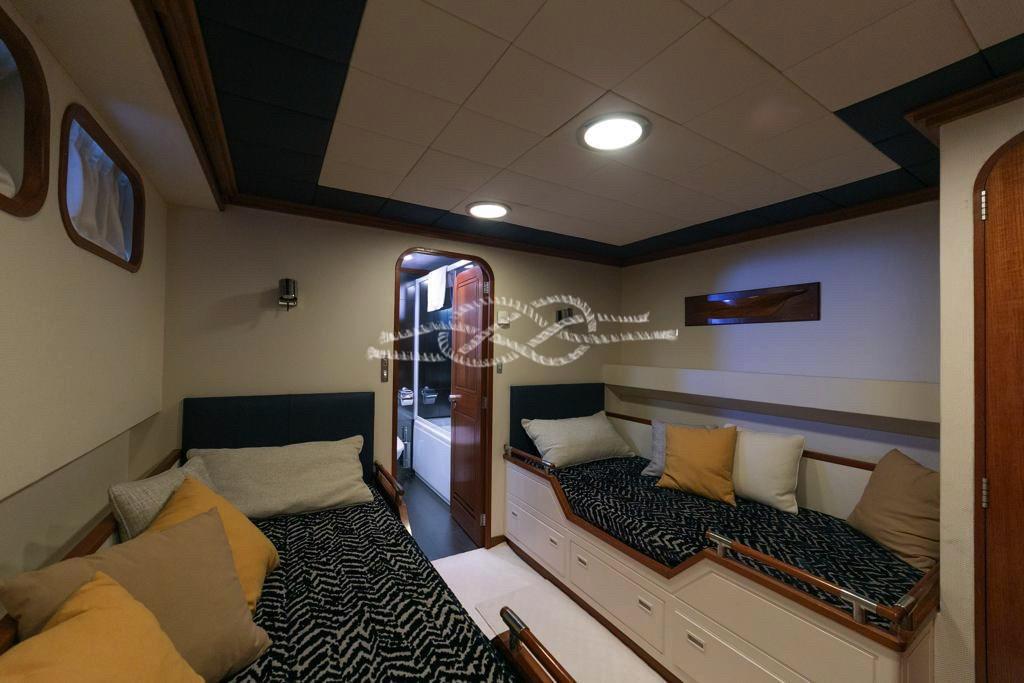 Cabine principale sur le pont principal avec lit double et salle de bain - Cabine VIP avec deux lits et salle de bain - Cabine invités avec deux lits plats et salle de bain - Cabine invités avec deux lits plats et salle de bain.