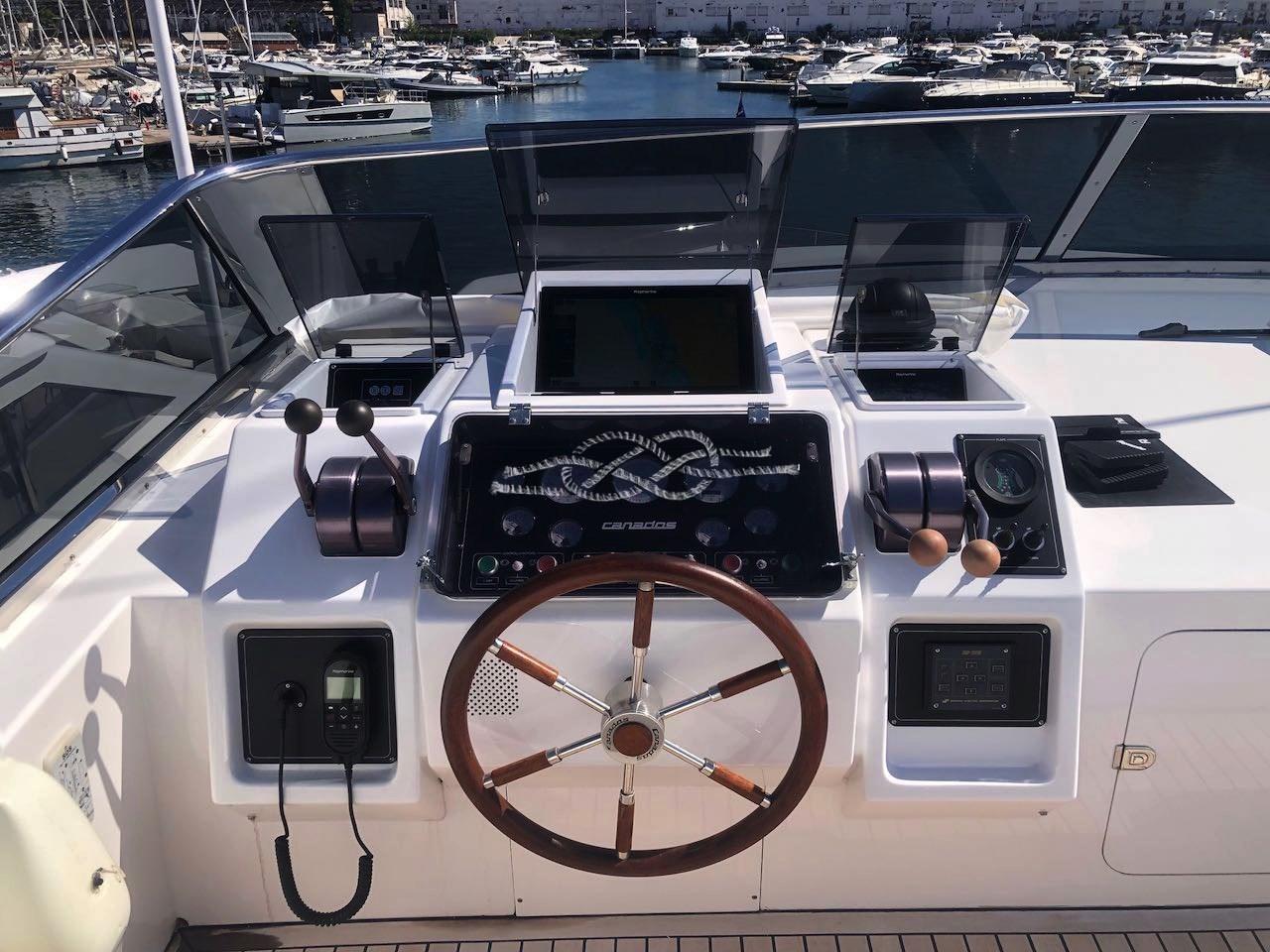 2023 : remplacement de toute l’électronique embarquée par Raymarine (GPS/Traceur, échosondeur, radar 72 mg, pilote automatique), installation de l’antenne SAT TV KVH, installation du téléphone SAT.
