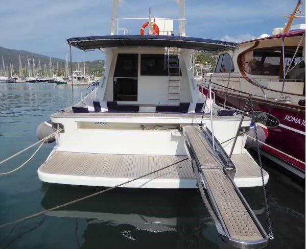 Travaux 2019/2020 : changement de batterie - caoutchoutage du pont - rénovation du pont en teck du pont volant et arrière - révision du propulseur d’étrave avec remplacement des batteries dédiées - atterrissage du générateur pour une révision extraordinaire - installation du deuxième ventilo-convecteur dans le carré.