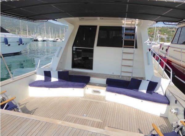 Grand salon avec canapés en cuir - salle à manger avec cuisine - timonerie interne et flybridge - grand cockpit.
