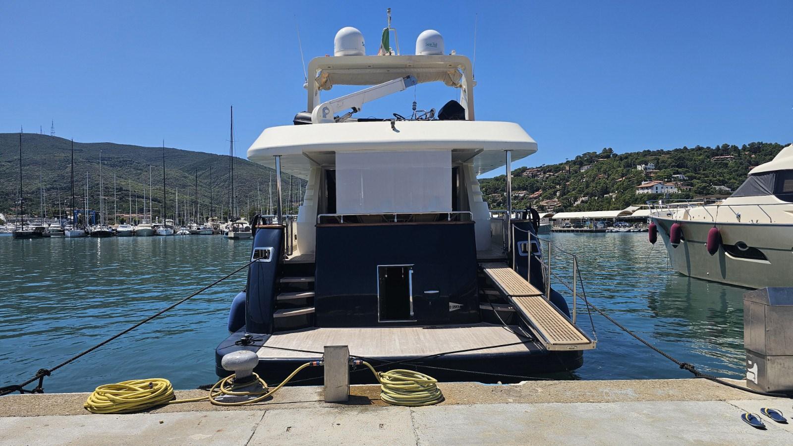 Alarme moteur, Alarme de pompe de cale, Eau sous pression, Système de vidange, Douche de cockpit, Double barre à roue, Flaps hydrauliques, Grue de flybridge, Extincteur(s) fixe(s), Éclairage de courtoisie, Passerelle, Plateforme arrière, Porte latérale, Porte latérale, Cockpit en teck, Prise de quai, Connexion eau sous pression à quai, Rollbar, Guindeau électrique, Echelle de bain, Selles pour Annexe, table de cockpit, Annexe, Corne, Winch électrique arrière.