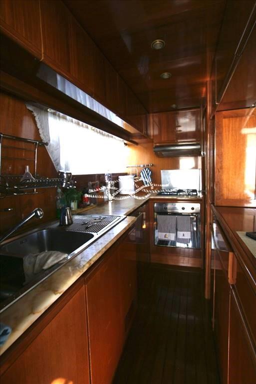 Troisième poste de contrôle à la poupe - propulseur d’avant Vetus - panneau électronique Boening pour vérifier les réservoirs d’eau, carburant, eau noire et eaux grises - caméra de vision de la salle des machines - climatisation - Distributeur d’eau Marinco - groupe électrogène Kohler 17 kW et Onan 12 kW - tender avec Suzuki 40 ch hors-bord - passerelle électrohydraulique Morsaverio - grue mouche Morsaverio - machine à laver - toilettes à eau douce Tecma - 1 réfrigérateur et 2 congélateurs dans la salle des machines - cuisine avec Réfrigérateur, four congélateur et fournecôte à gaz 4 brûleurs - placard avec double réfrigérateur/machine à glaçons, évier et plaque électrique à deux brûleurs en vol - TV - antenne SAT Seatel - décodeur SAT.
