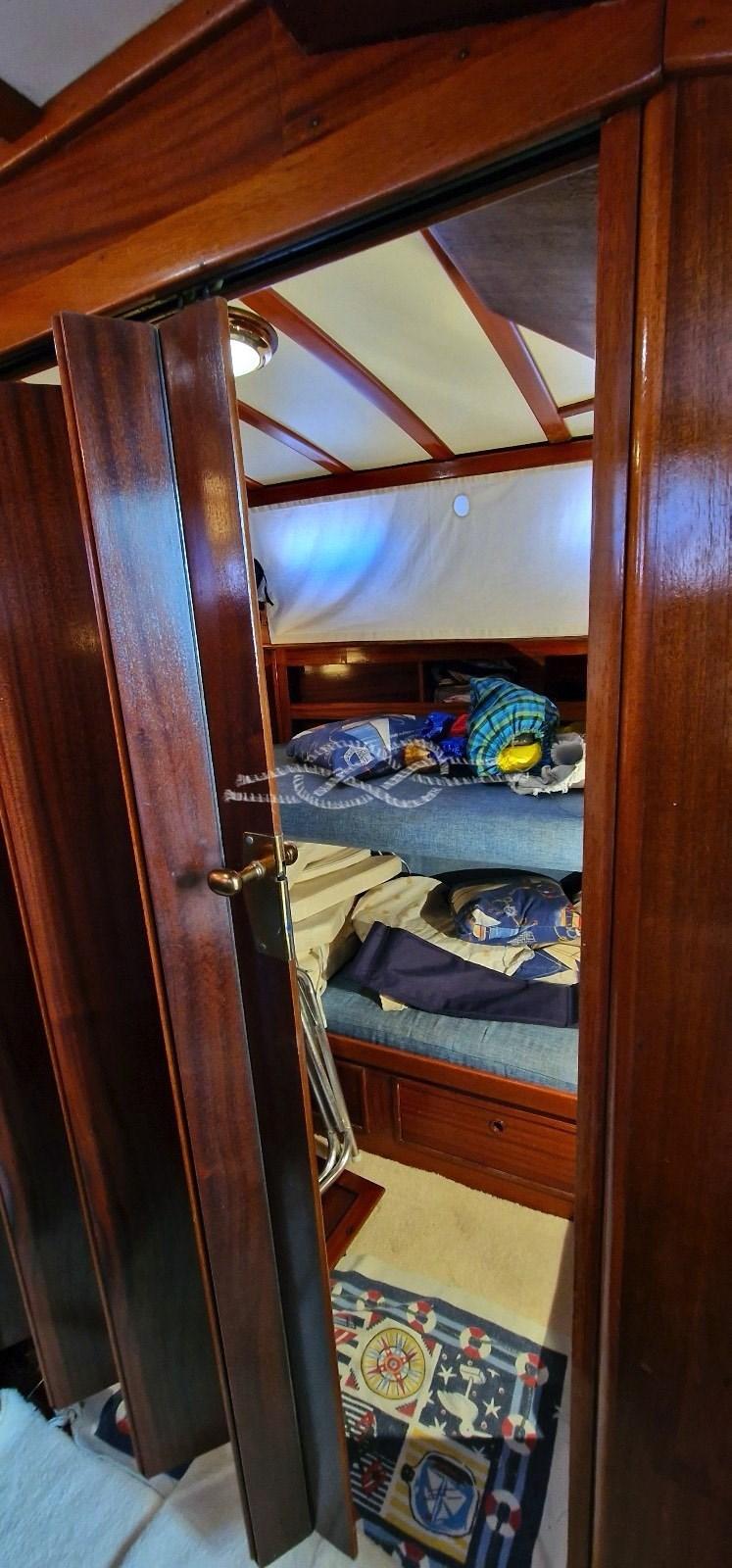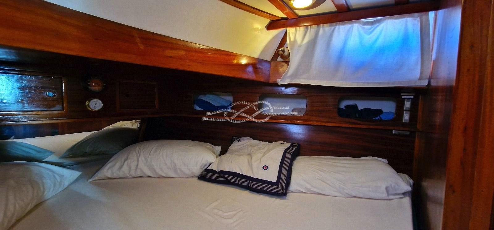 Cabine propriétaire à l’avant avec deux lits en forme de V qui peuvent être convertis en lit double - cabine avec quatre lits superposés, possibilité de séparer la cabine avec cloison coulissante en deux - salle de bain invités.