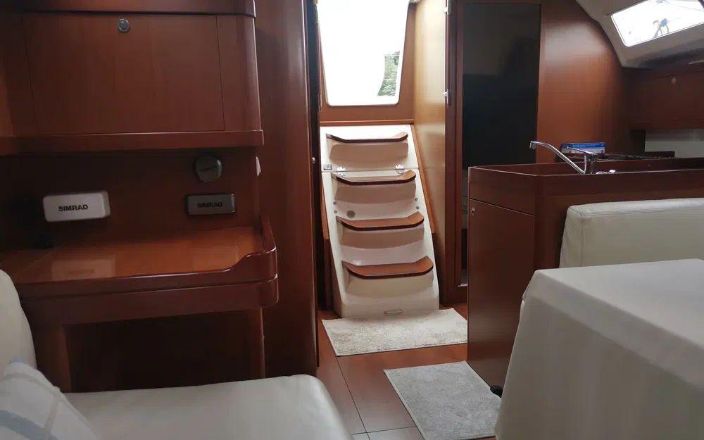 À bord, tout est pensé pour la vie en mer : 3 cabines, jusqu’à 6 couchages, une spacieuse salle de bain, une kitchenette complète (réfrigérateur, évier, chauffe-eau, rangements…), et même une véritable table à cartes pour préparer sereinement vos escales. Le cockpit est tout aussi accueillant avec sa table pour partager des moments entre équipiers. Côté navigation, rien ne manque : GPS, pilote automatique, VHF, sondeur, loch, et même un panneau solaire pour gagner en autonomie. L’armement est complet — du guindeau électrique au gréement en passant par le jeu de voiles soigné (génois sur enrouleur manuel, grand-voile sur lazy bag et lazy jack).