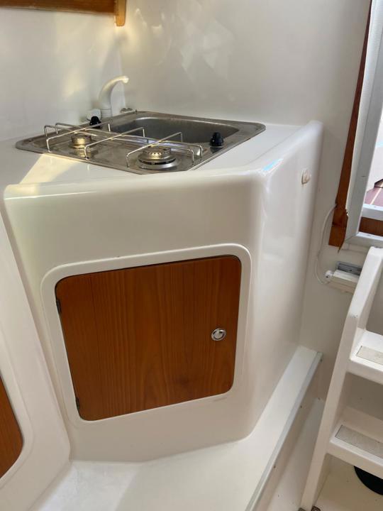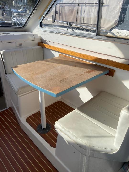 Cockpit avec bimini, intérieur fonctionnel offrant un coin repas convertible, une kitchenette (évier + réchaud gaz) et un WC marin.