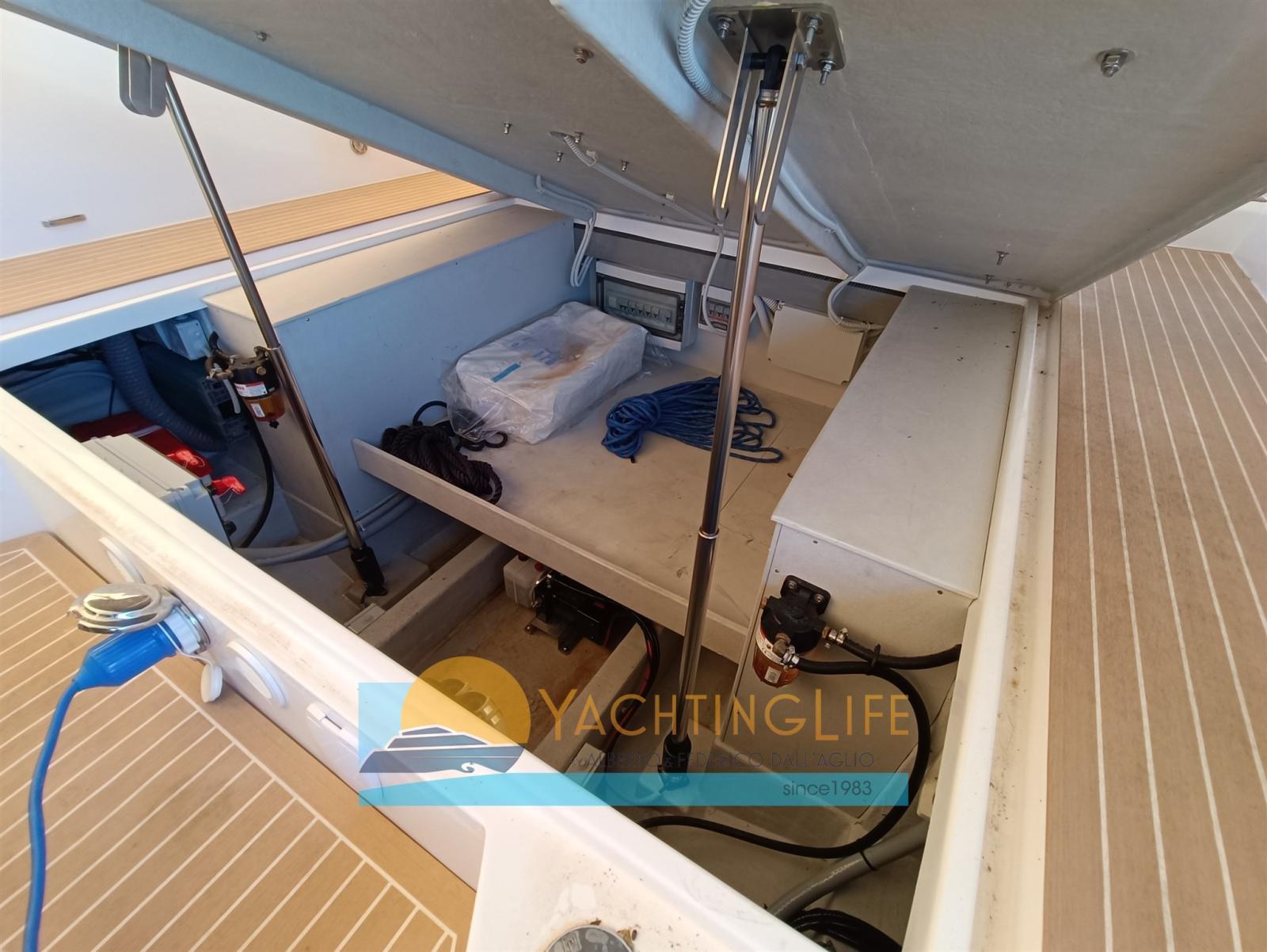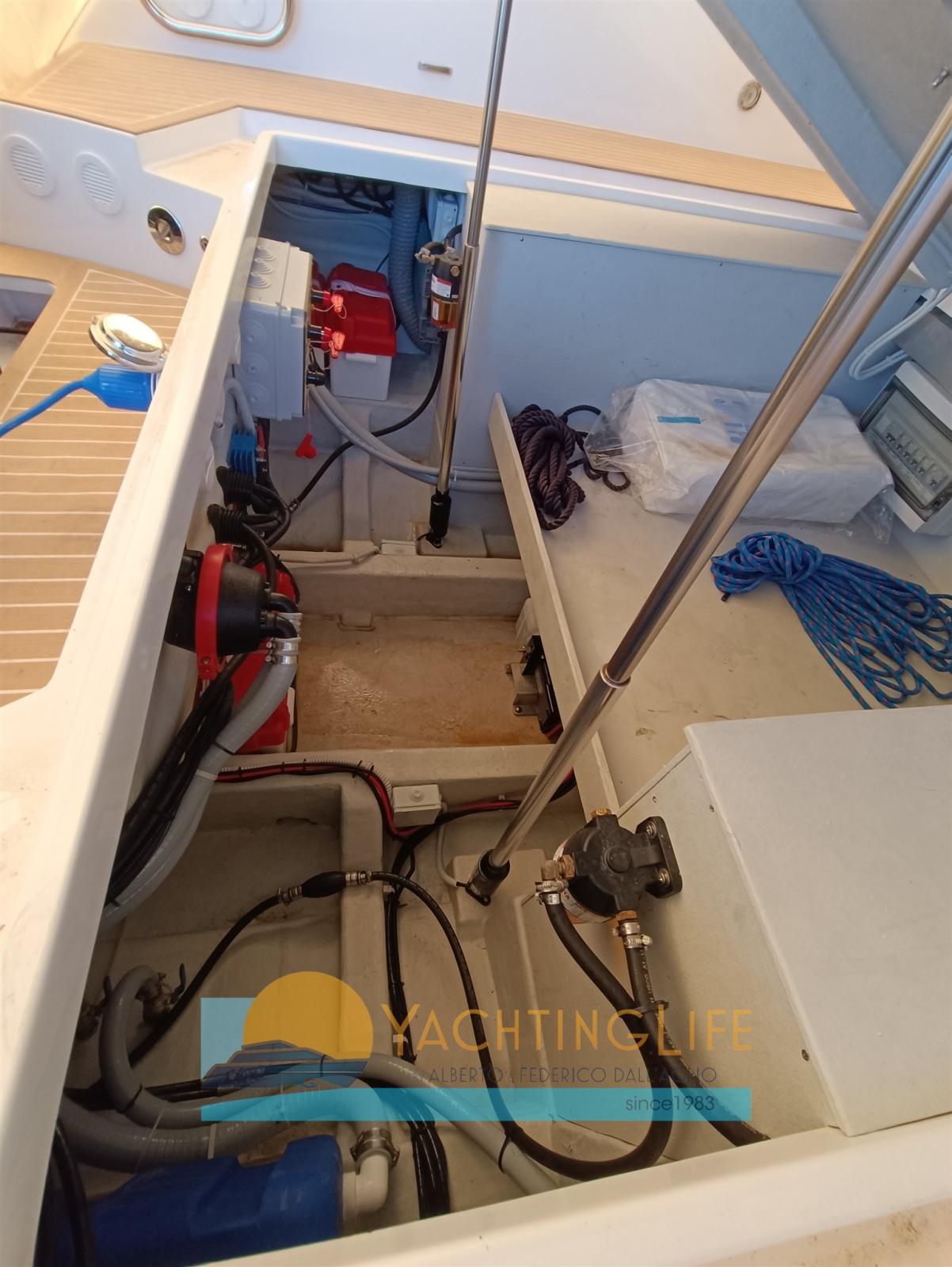 Eau sous pression, 2 Douche de cockpit, Flaps électriques (Zip Wake), Indicateurs de flaps, Lavabo dans le cockpit, Pompe de cale automatique, Cockpit en teck (sintetico), Prise de quai, Guindeau électrique, 2 Echelle de bain, table de cockpit (elettrico), Corne.