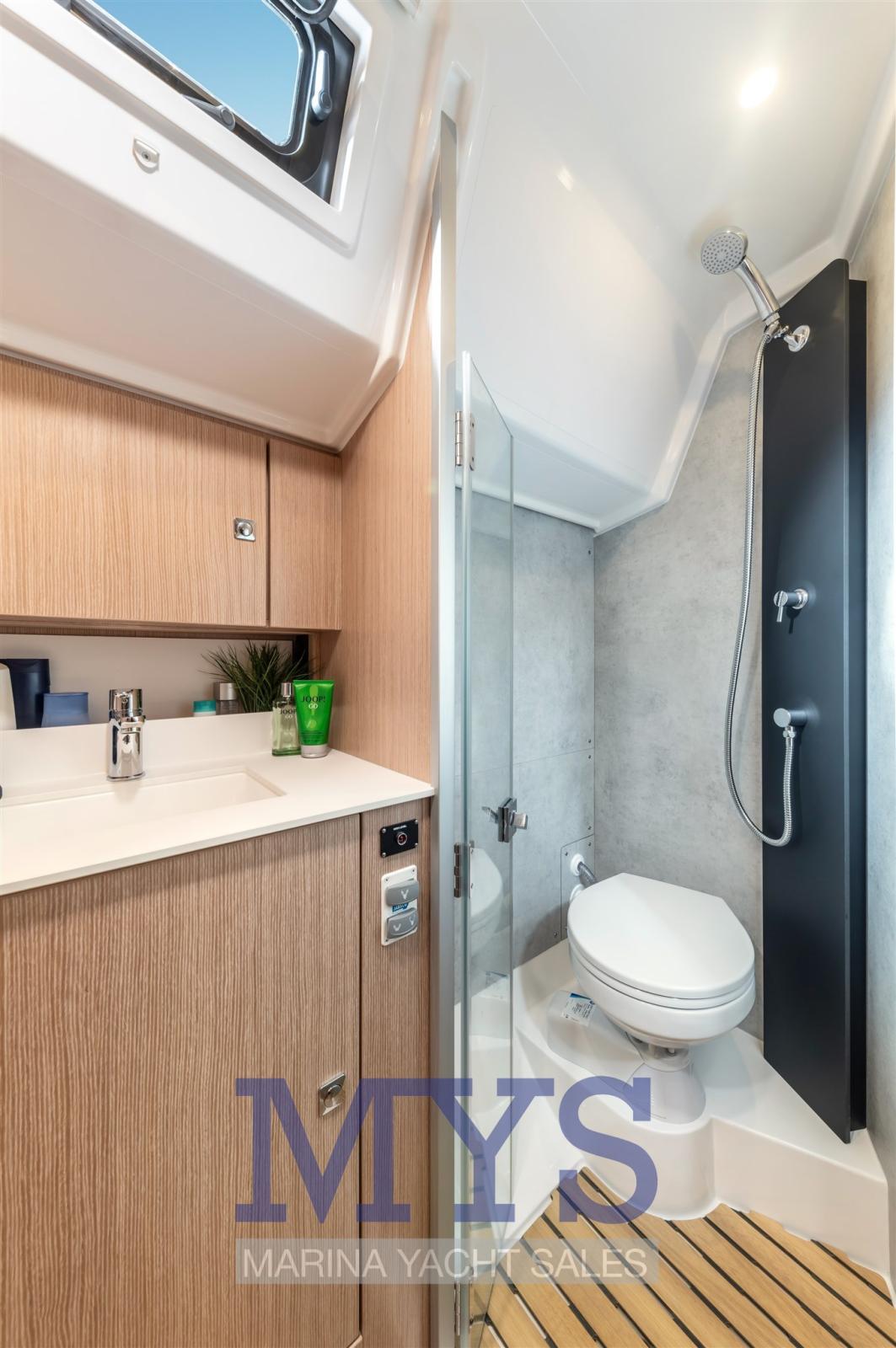 Cabine principale à l’avant avec lit double et salle de bain attenante avec douche.
