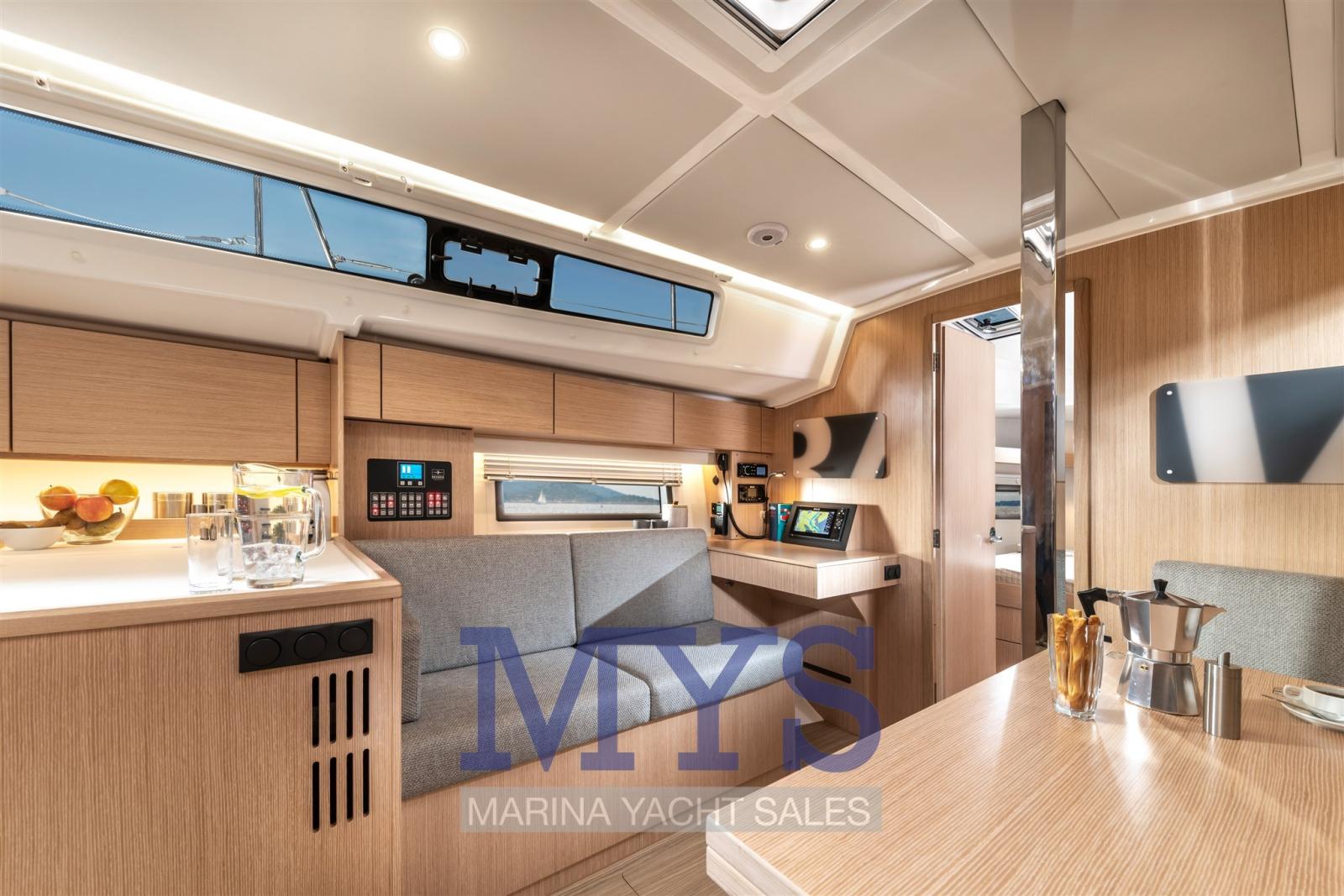 Alarme moteur, Alarme de pompe de cale, Eau sous pression, Douche de cockpit, Double barre à roue, Éclairage de courtoisie, Plateforme arrière, Pompe de cale automatique, Pompe de cale manuelle, Porte latérale, Cockpit en teck, Prise de quai, Guindeau électrique, Gréement monotoron, Echelle de bain, table de cockpit.