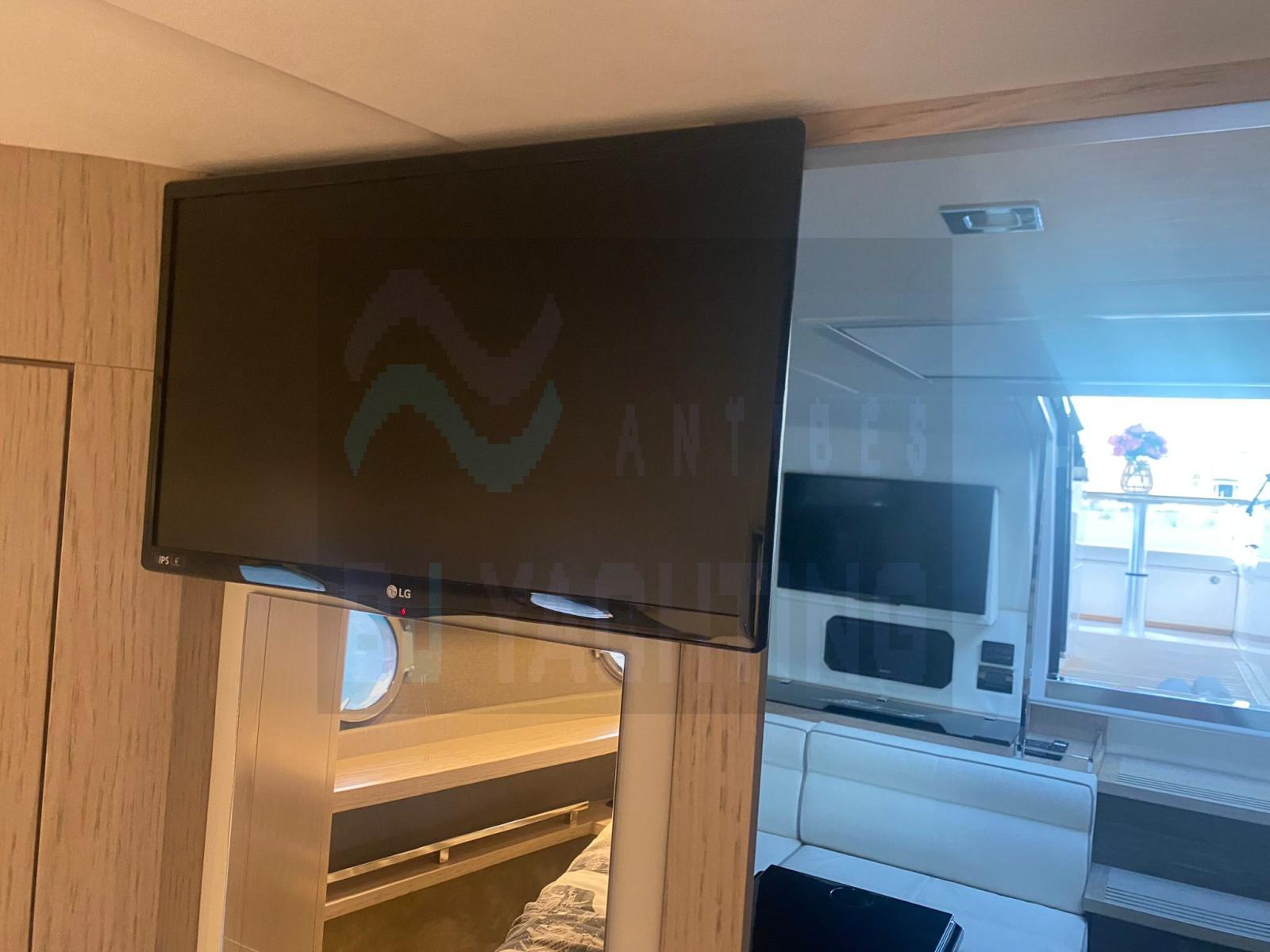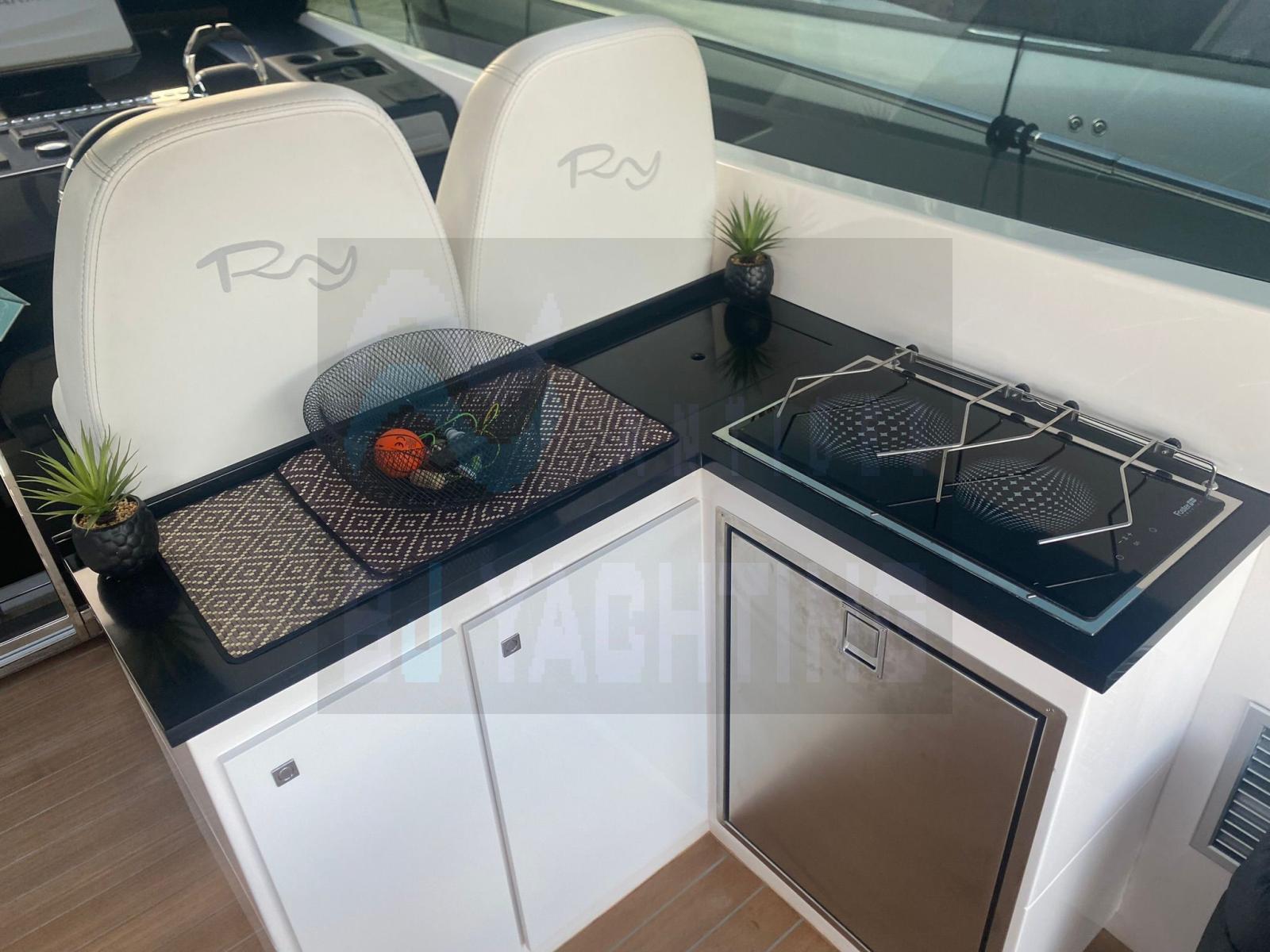 Ce bateau offre un vaste cockpit en teck sans marche, avec une table électrique transformable en bain de soleil, une grande chaise longue, et un espace cuisine équipé. Le toit ouvrant permet de réguler lumière et chaleur.