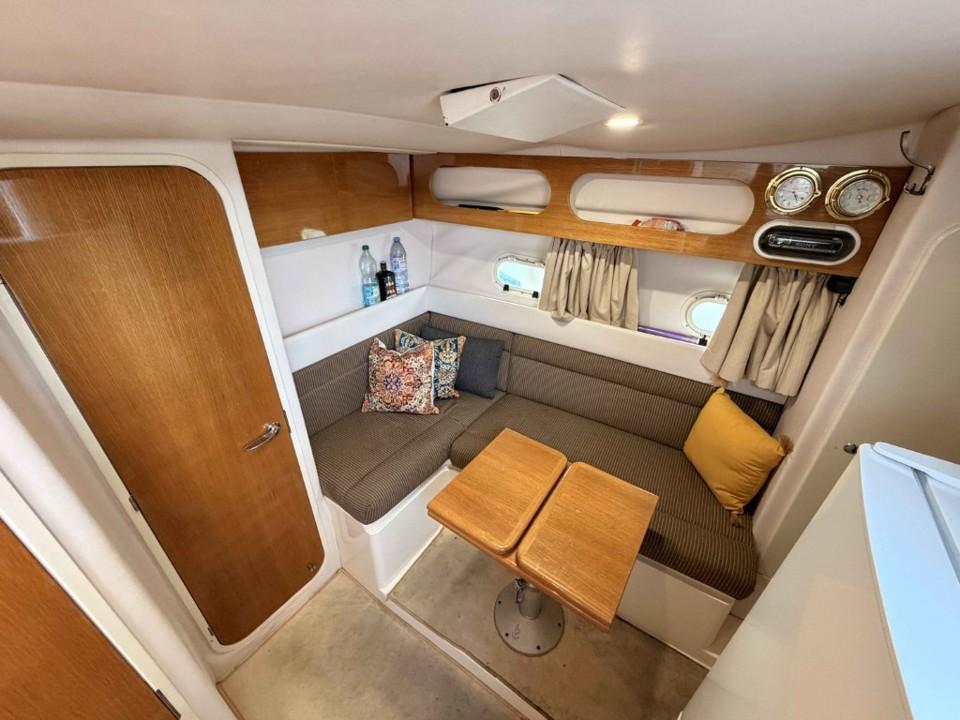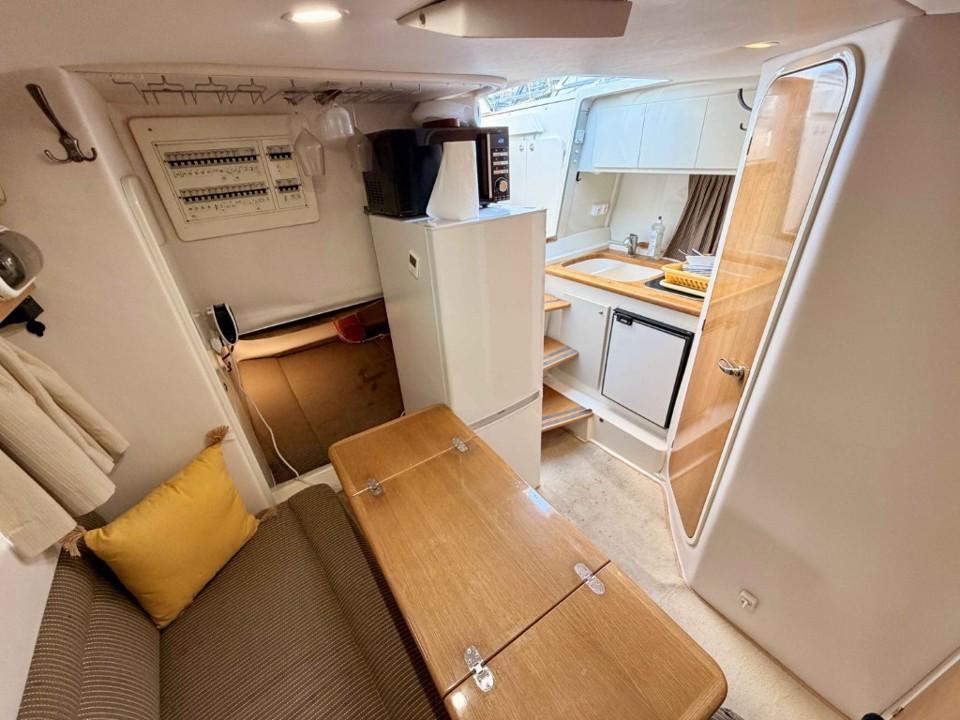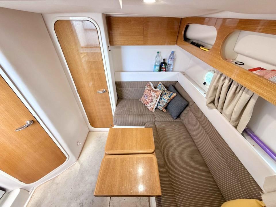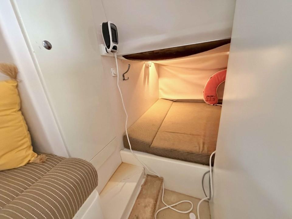 L’intérieur propose une cabine double, un espace couchage supplémentaire, une cuisine équipée et un salon confortable, permettant d’envisager facilement des week-ends ou petites croisières.