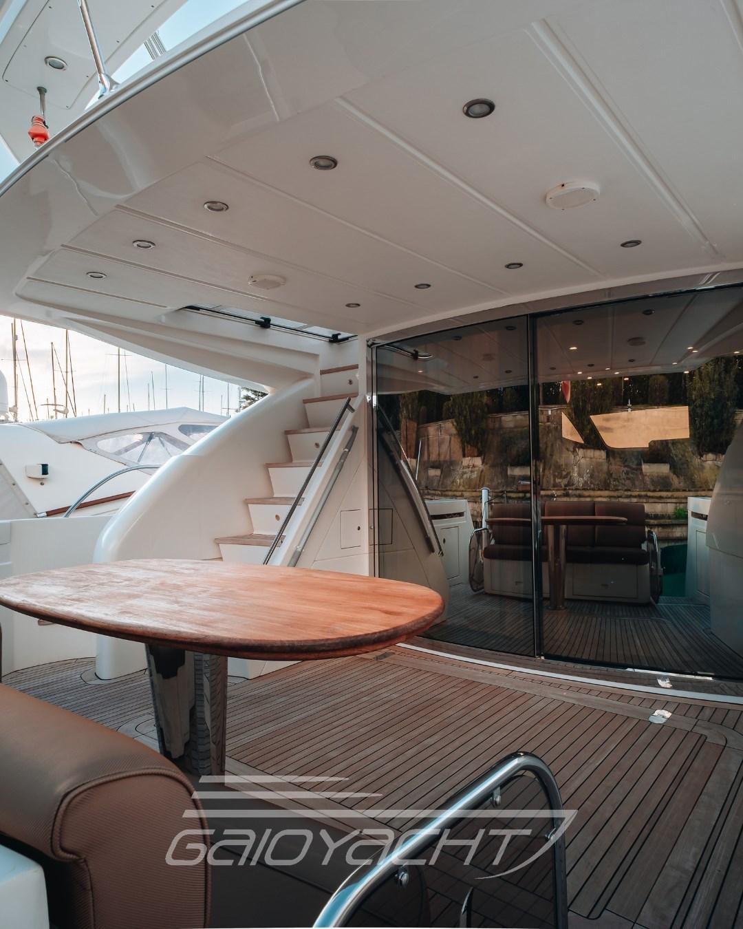 Alarme gaz, Alarme moteur, Alarme de pompe de cale, Ancre (Da sostituire), Ouverture du compartiment moteur électrique, Auto Dynamic Trim Interceptor, Eau sous pression, Trim hydraulique, Passavant en teck, Douche de cockpit, Double barre à roue, Phare de poursuite, Flaps électriques, Bossoirs, Bossoirs pour annexe, Extincteur(s) fixe(s), Indicateurs de flaps, Éclairage de courtoisie, Passerelle, Plateforme arrière, Pompe de Vidange du Réservoir d’Eaux Usées, Porte latérale, Porte latérale, Cockpit en teck, Prise de quai, Connexion eau sous pression à quai, Répétiteur électronique, Guindeau Hydraulique, Echelle de bain, Selles pour Annexe (Predisposizione), table de cockpit, Corne, Pont en teck, Winch électrique arrière.